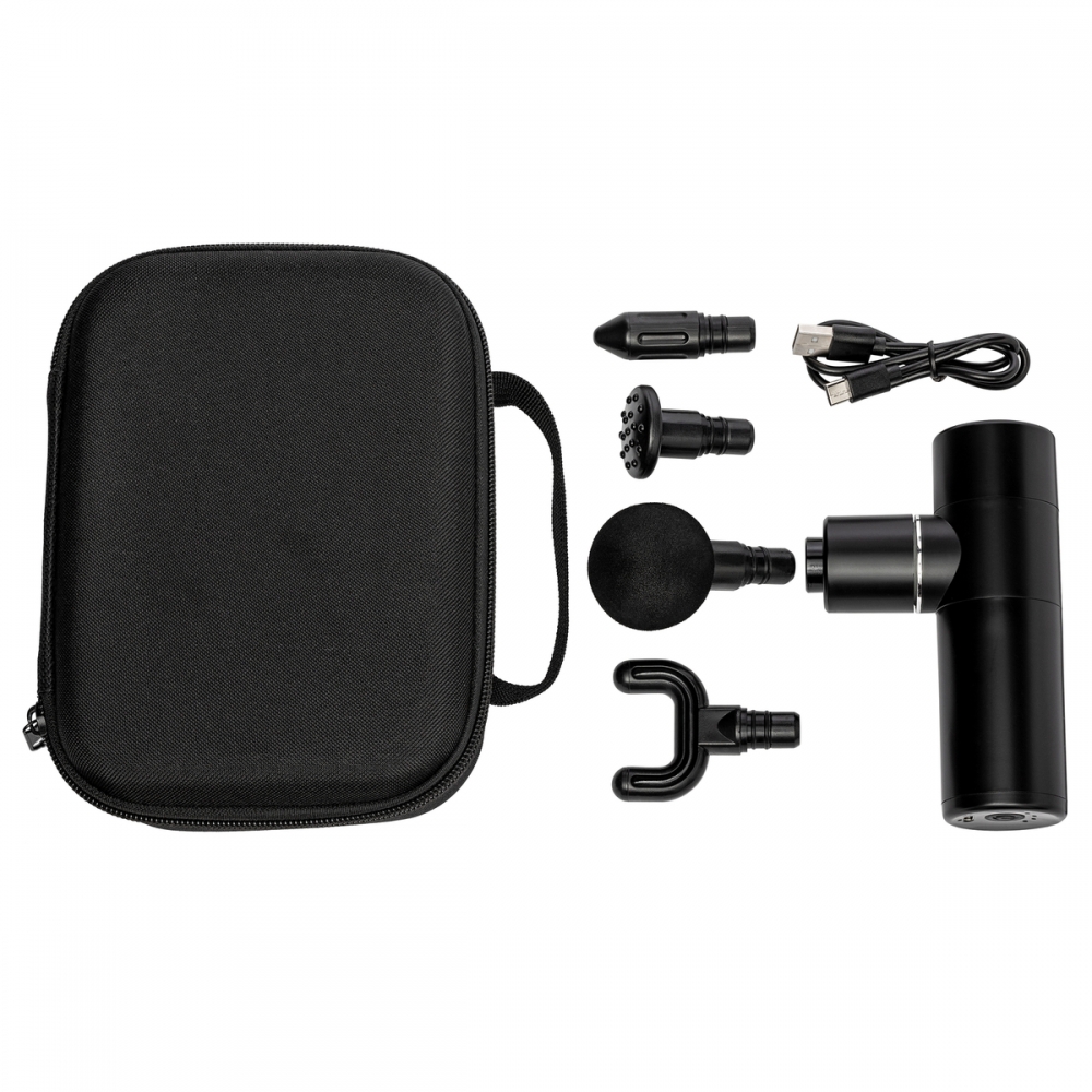 ABS-Massagepistole mit Bürstenmotor (Geschwindigkeit 1.800 - 3.200 U / min) und 1.200 mAh Akku. 5V Eingang und 6 Intensitätsstufen, um die Muskeln zu massieren. Individuell pro Stück in einer Geschenkbox verpackt, einschließlich 4 Massageköpfe.