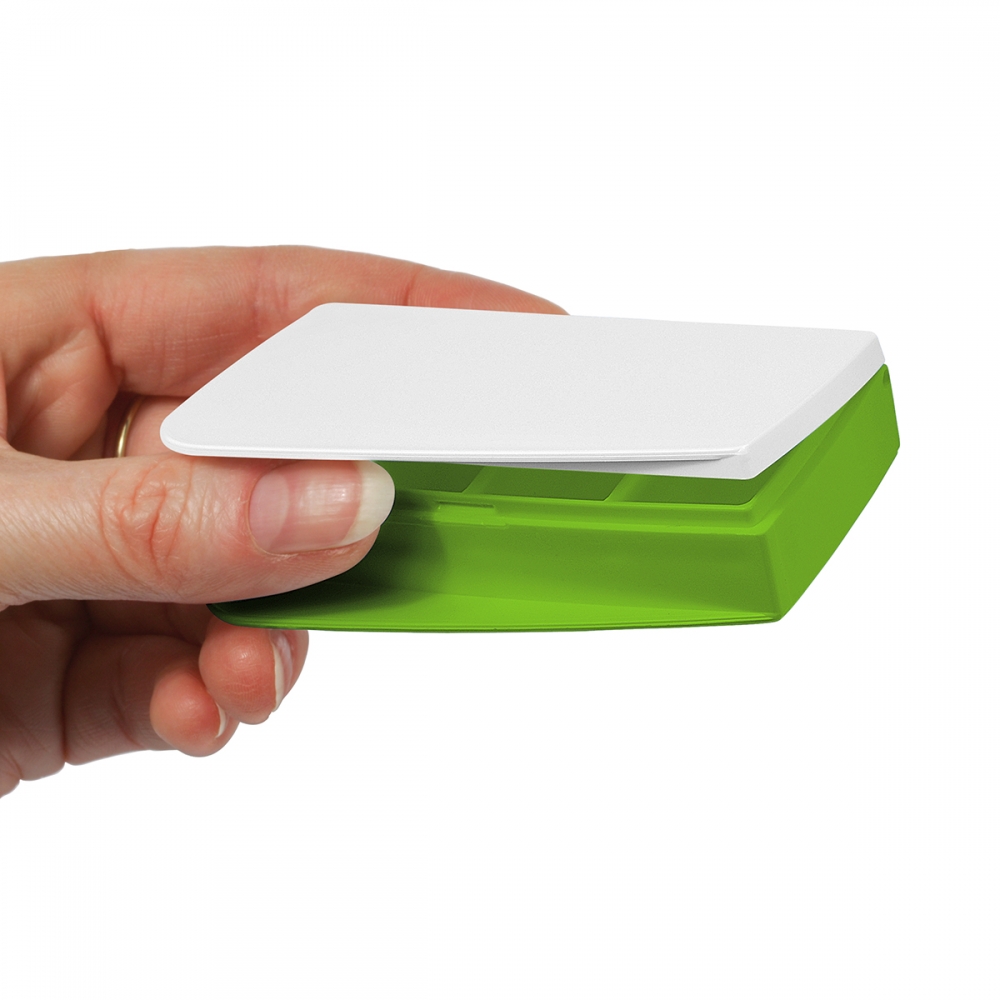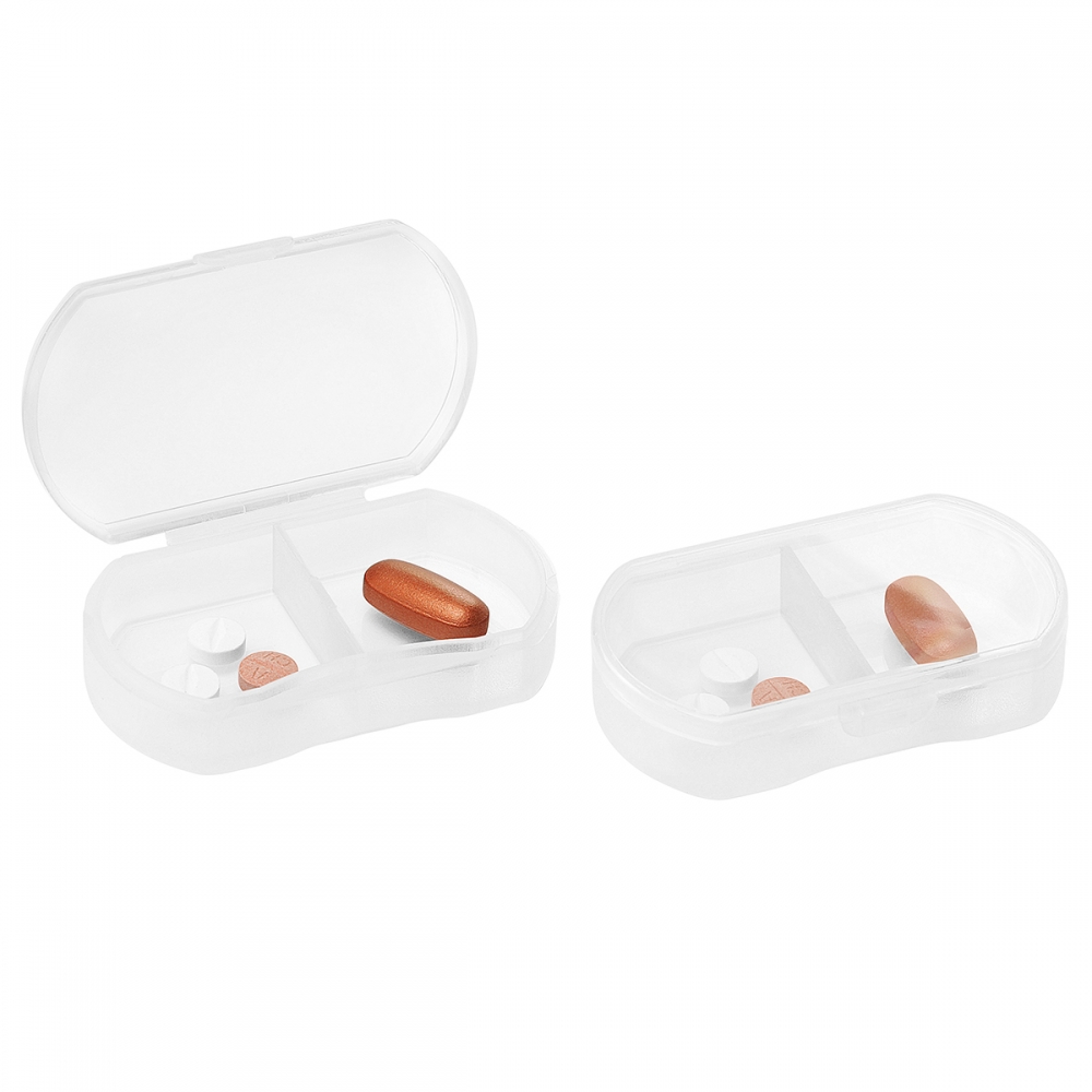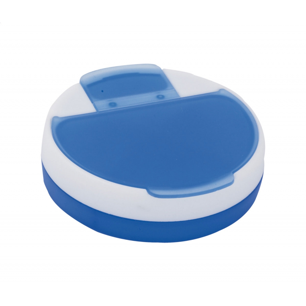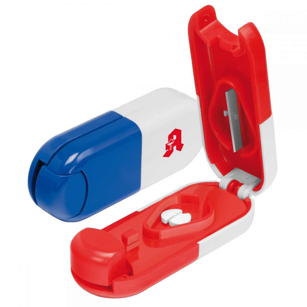 Pillendose mit einem Aufbewahrungsfach und einem Schneider. Die zwei farblichen Innendosen lassen sich leicht unterscheiden und entnehmen. 94 x 48 x 16 mm