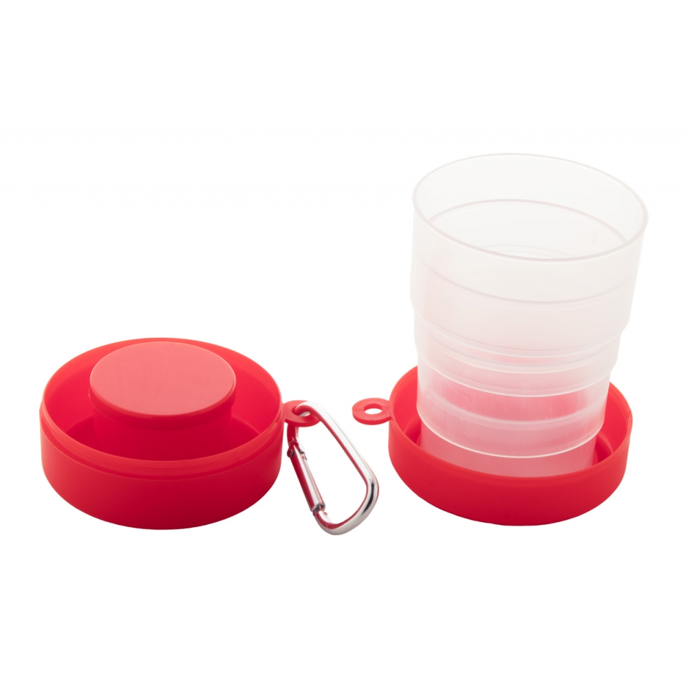 Faltbarer Becher aus recyceltem PP-Kunststoff mit Pillendosefach und Metallkarabiner. Füllmenge: 220 ml. BPA-frei.