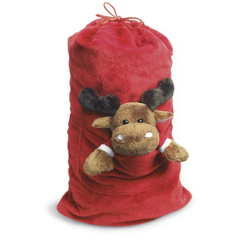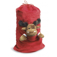 Ein Plüsch-Elch für die Deko zu Weihnachten, ist hier in einem schönen roten Weihnachtssäckchen mit Anhängekärtchen verpackt. Platz für Ihren Werbeeindruck ist auf dem Standardmotiv des Anhängekärtchens oder eine eigene Gestaltung, jeweils ab 250 Stück.