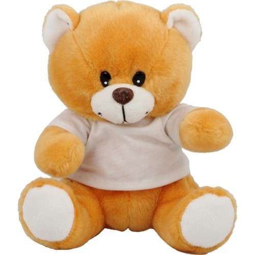 EN 71, kurzes, flauschiges Material in braun, hochwertige Füllung, waschbar, mit CE Kennzeichnung, Augen 2-farbig, ca. 22 cm hoch, weißes T-Shirt, 50 Stück im Karton
