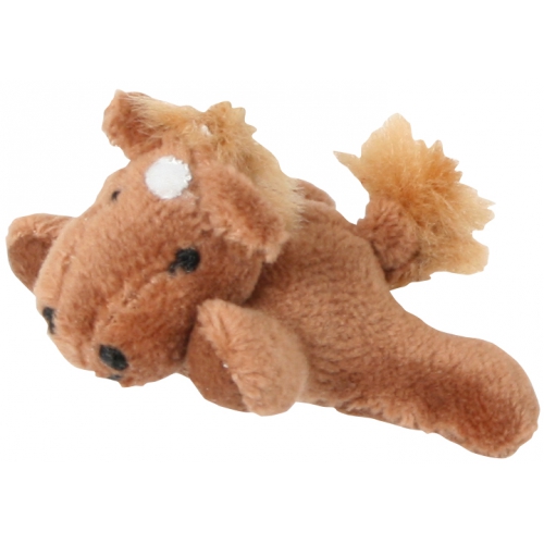 Mit weichem Plüschkopf, Mähne aus Wollfäden, Zaumzeug und Halstuch. Drückt man dem Tier aufs Ohr, hört man Galoppiergeräusche, das Pferd wiehert und bewegt den Mund. Achtung! Nicht geeignet für Kinder unter 36 Monaten.
