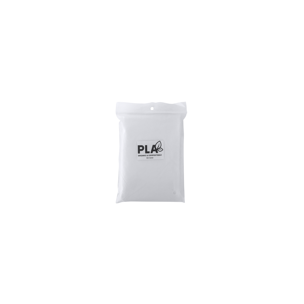 Poncho in Erwachsenengröße, hergestellt aus widerstandsfähigem PLA-Material -PolyLactic Acid-, das zu 100% aus natürlichen Ressourcen wie Maisstärke, Yucca oder Zuckerrohr gewonnen wird und am Ende seiner Lebensdauer zu 100% kompostierbar ist. Größe 127 x 102 cm, Einheitsgröße. Präsentiert in einem individuellen PLA-Beutel mit unverwechselbarem Material.