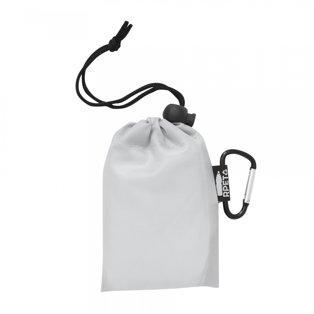 Transparenter Poncho aus LDPE in Einheitsgröße für Erwachsene. In RPET-Polyester-Tragetasche, mit Aluminiumkarabiner. Mit RPET-Label.