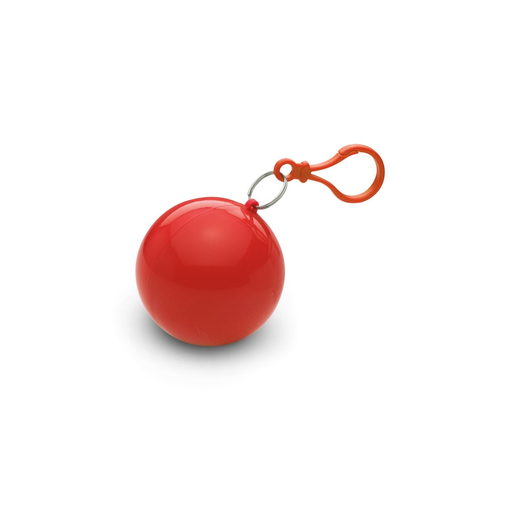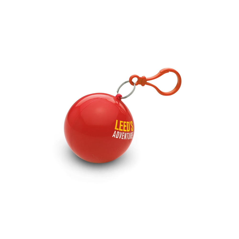 Ein Regenponcho verpackt in einer Kunststoffkugel. Sehr praktisch, wenn man unterwegs vom Regen überrascht wird. Den Schlüsselanhänger können Sie leicht an einem Fahrrad oder einer Tasche befestigen.