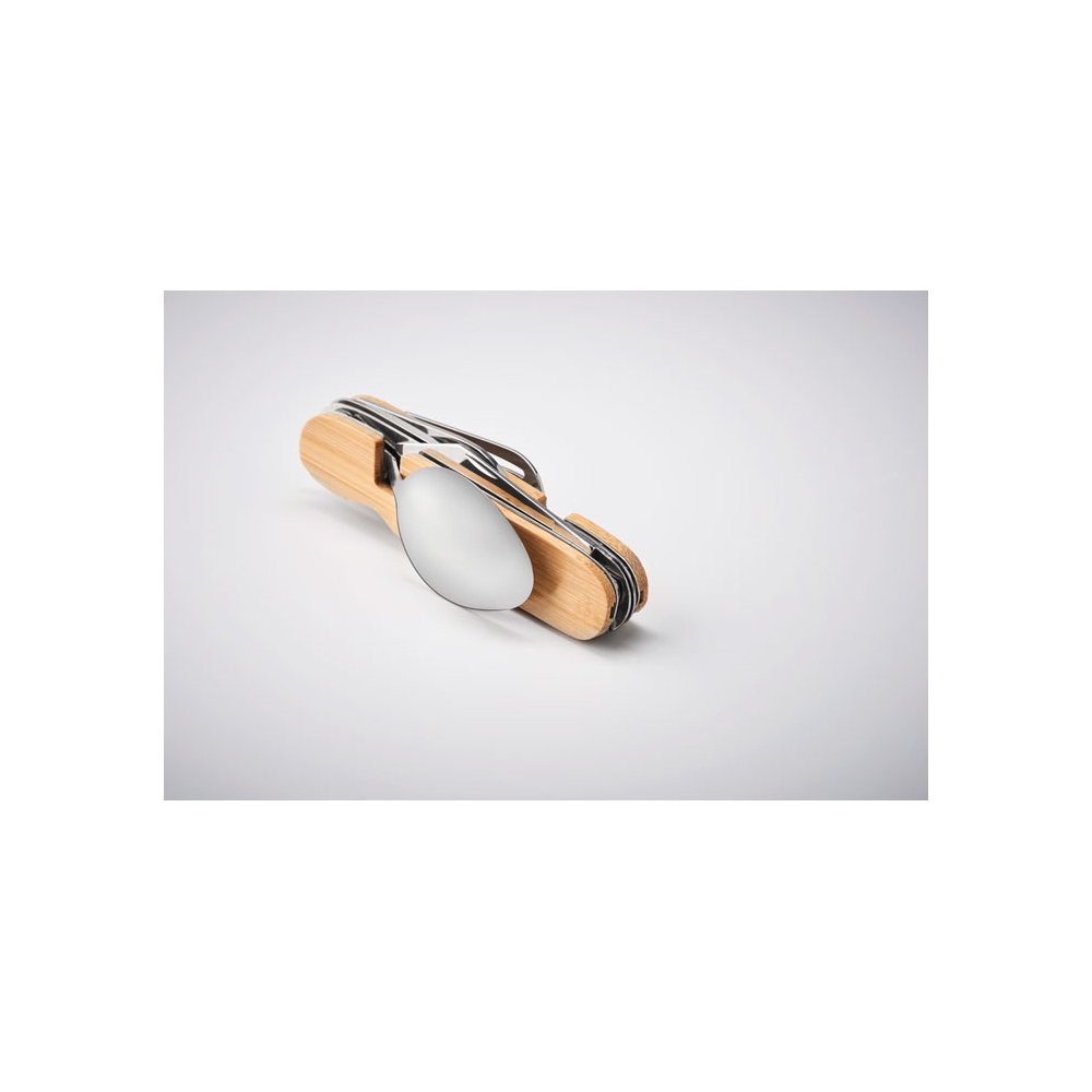Artikel-Nr: OCBMO6359-03Klappbares 3teiliges Campingbesteck aus Edelstahl. Bestehend aus Messer, Gabel und Löffel. Verpackt im RPET-Beutel.