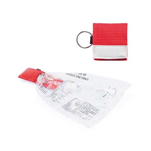 gewebtes Erste Hilfe Etui mit Klettverluss und Schlüsselring, inkl. Mund-zu-Mund Beatmungsmaske, Low Cad/AZO frei, CE geprüft. Farbe/n: rot. Maße: 5,5 x 2 x 5 mm.