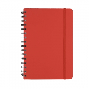 Ringbuch aus stabilem zweifarbigem Recyclingkarton mit weichem Einband, Gummizug und passendem Stift aus Recyclingkarton. In kräftigen Farben.