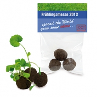 Es handelt sich hierbei um kleine Kugeln, die – bestehend aus Samen, Erde und Tonpulver – beliebig und direkt auf dem Boden verteilt werden können. Es ist nicht nötig sie einzupflanzen oder unterzugraben. Die Werbeanbringung erfolgt auf dem Reiter, das Tütchen ist mit 3 Kugeln befüllt (wahlweise mit Sommerblumen- oder Wildblumensamen). Größe: 8,1 x 12 cm
