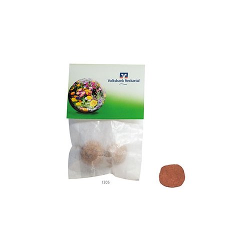 Inhalt: 2 Tonkugeln mit Samenfüllung im Pergamintütchen. Samen: bunte Blumenmischung