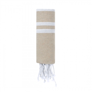 Artikel-Nr: KTO21490023000Bademantel in recycled Baumwolle von 180 g / m2. Gestreiftes Design in weißer Kombination mit glitzernden goldenen Streifen, Enden in glattem Beige und ausgefallenen Fransen an den Enden in Kordel-Optik. Enthält ein Etikett mit dem Logo für recycelte Baumwolle.
