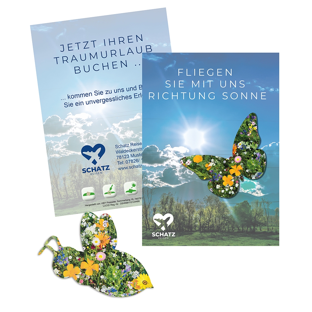 Artikel-Nr: HOP11.41604.00Ausdruckstarkes, individuell bedrucktes, flaches Klappkärtchen in der Kontur einer Blume. Das aufgeklebte Samenpapier ist als Bienchen, Schmetterling oder Blümchen lieferbar.