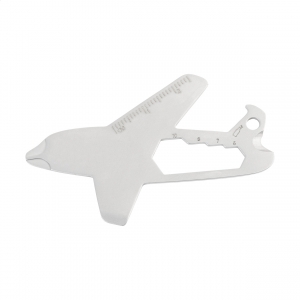 Multitool in Flugzeugform aus recyceltem Edelstahl mit Schlüsselring, Flaschenöffner, Lineal, Kreuz- und Schlitzschraubendrehern, Sechskantschlüsseln und Drahtschneider.