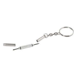 Kompaktes Brillenreparaturset in transparenter PP-Box. Enthält ein Reinigungstuch aus 100 % RPET-Mikrofaser (220 g / m²) und einen Mini-Schraubendreher mit Schlüsselring. Tuchgröße: 18 x 15 cm.