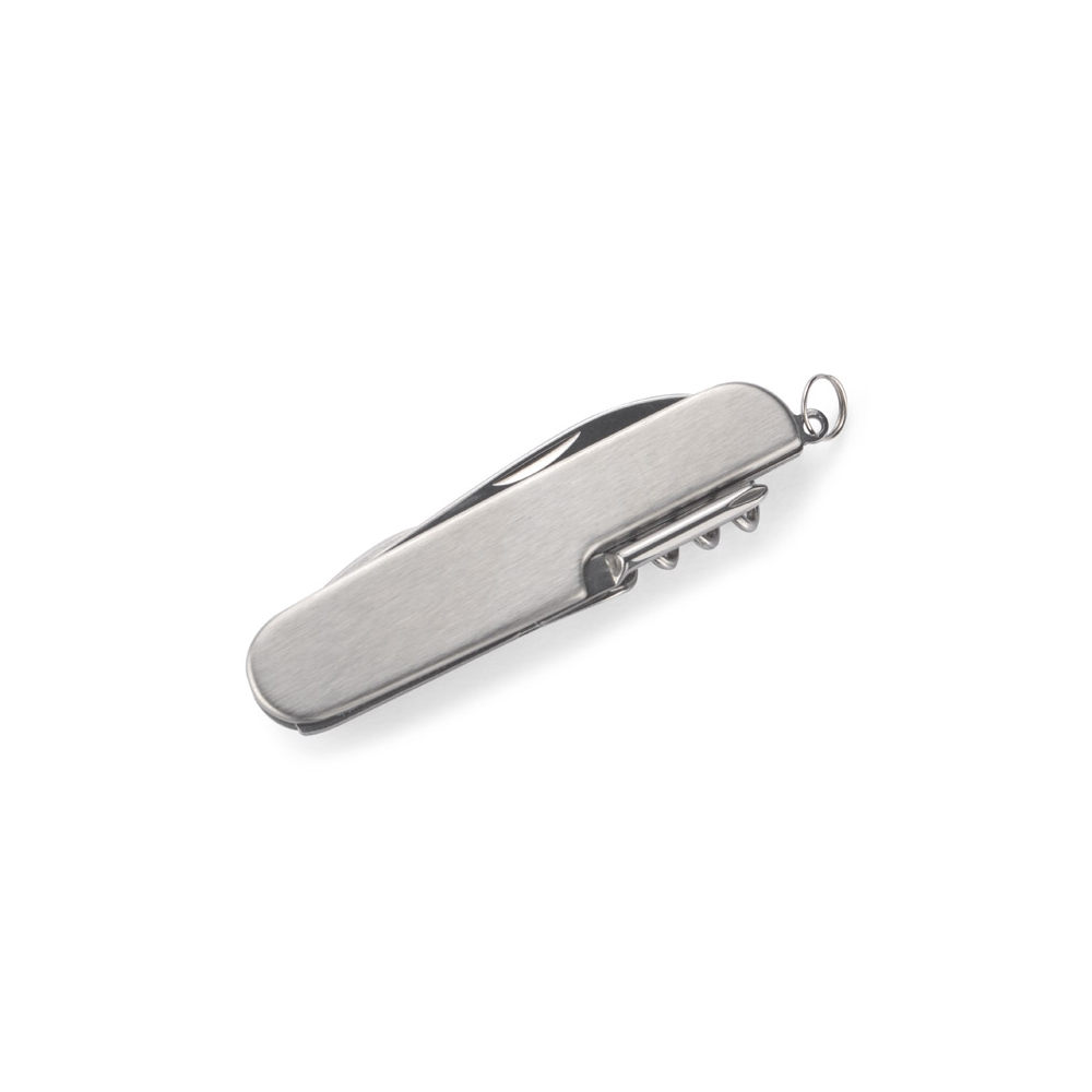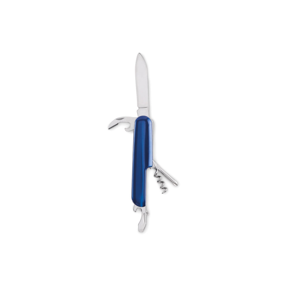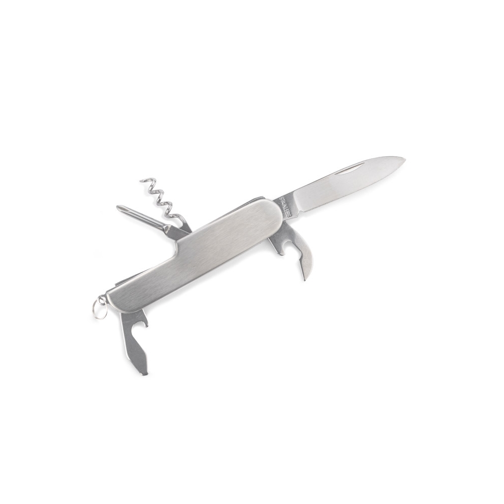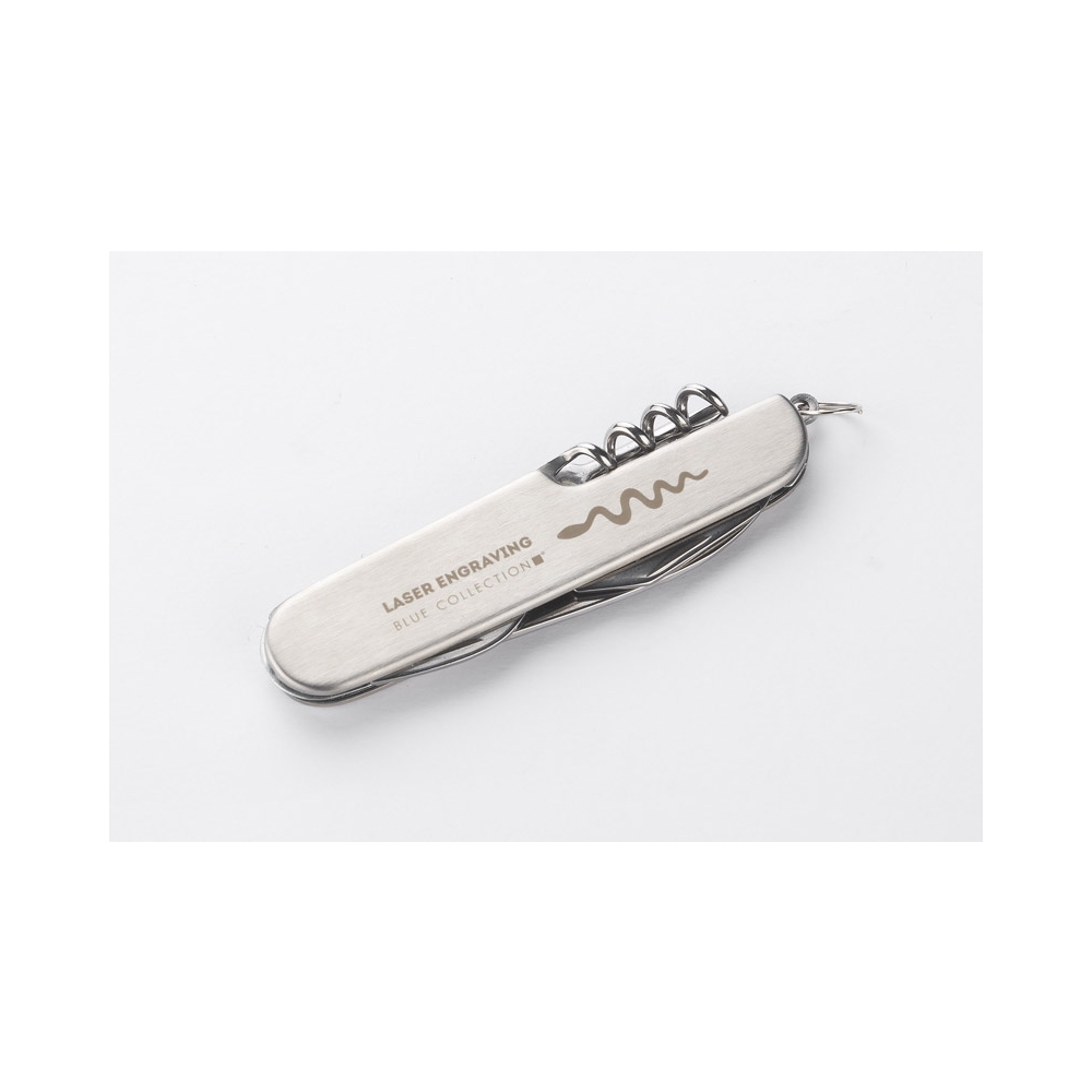 Multi-Tool-Taschenmesser aus recyceltem Aluminium. 5 Funktionen: Große Klinge, Kapselheber, Schraubendreher, Korkenzieher und Dosenöffner.