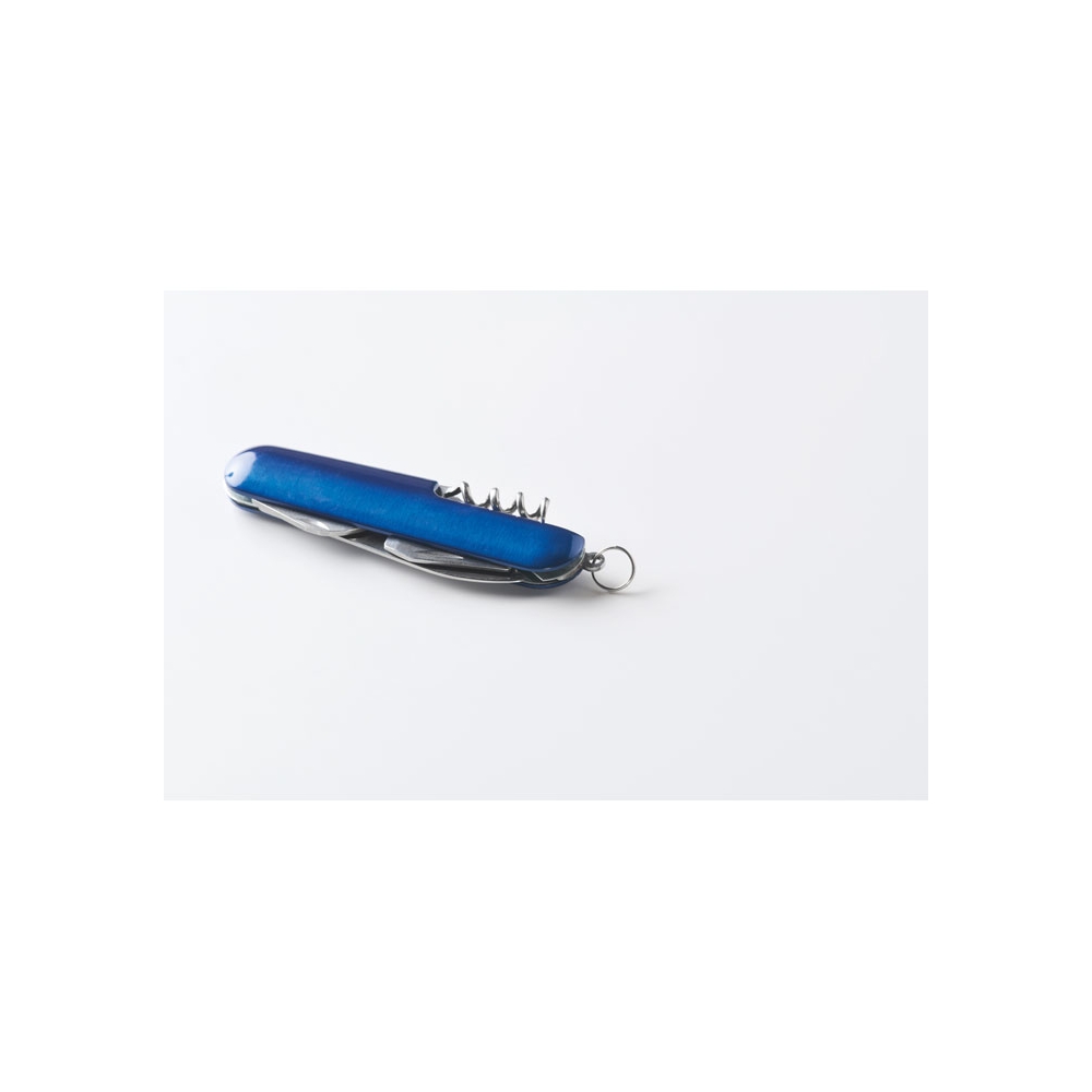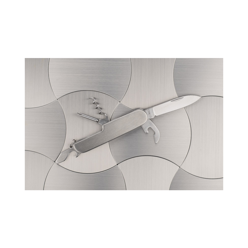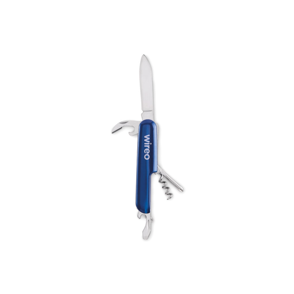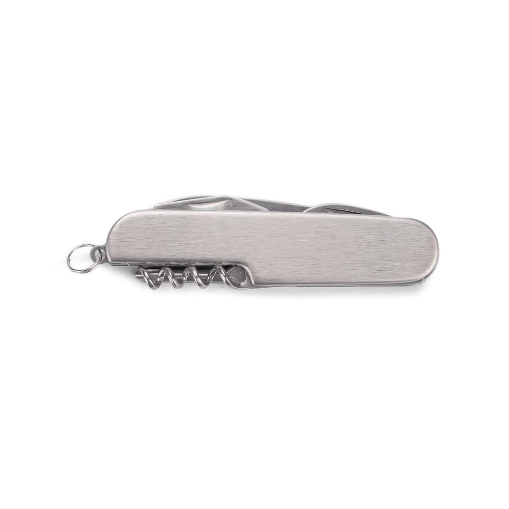 Multi-Tool-Taschenmesser aus recyceltem Aluminium. 5 Funktionen: Große Klinge, Kapselheber, Schraubendreher, Korkenzieher und Dosenöffner.