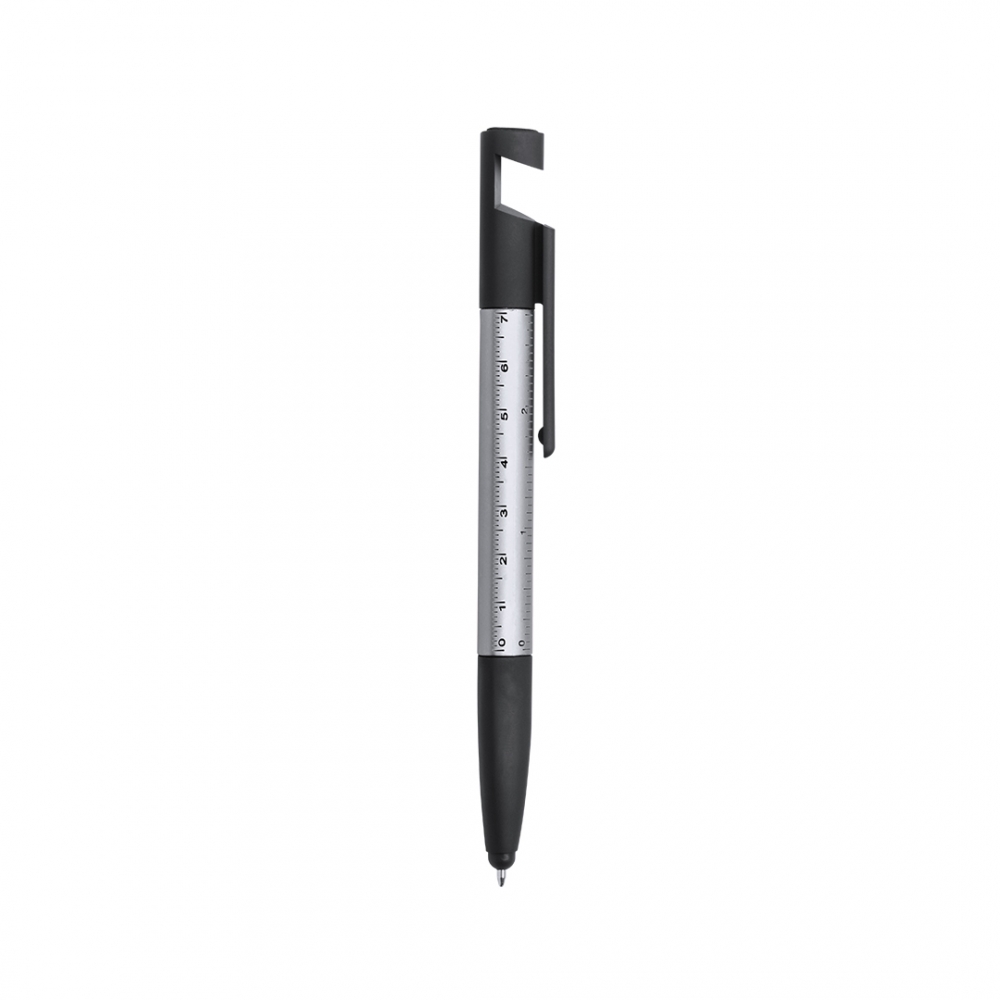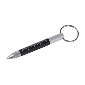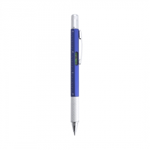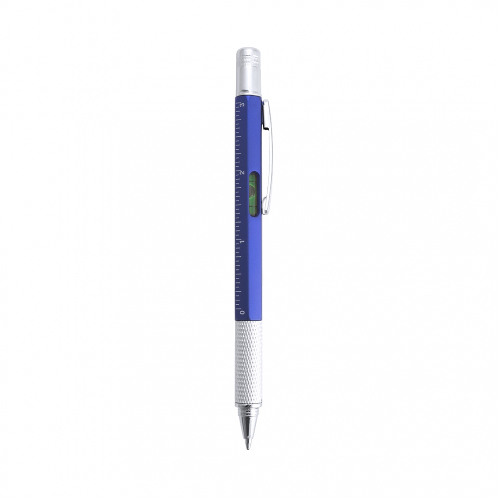 Kunststoffkugelschreiber, blauschreibend, mit Metallclip. Funktionen: Schlitz- und Kreuzschraubendreher, Wasserwaage, und 7cm- / 3 Zoll-Linealen.