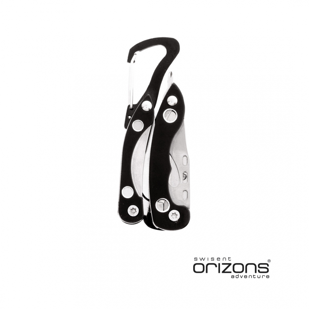 Multi-Tool von Orizons mit 6 Edelstahl-Funktionen und Aluminiumgriff in lebendigen Farben. Mit Zange, Taschenmesser, Dosenöffner mit Schlitzschraubendreher mit Flaschenöffnerfunktion, Kreuzschraubendreher und Karabiner. Präsentiert in einer attraktiven Designbox mit dem Markenlogo.