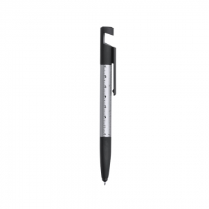 7-in-1 Dreh-Kugelschreiber in verschiedenen kräftigen Farben. Mit Ständer für Mobilgerät, Stylus, Displayreiniger, integriertem Lineal mit Skala in Zentimetern und Zoll, sowie Schlitz-und Kreuzschraubendreher. Blaue Tinte.