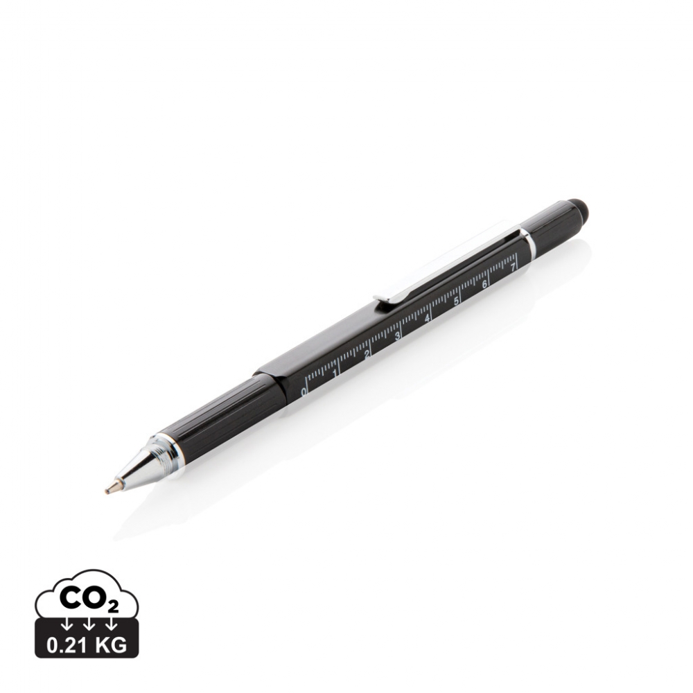 Handlicher Multifunktions-Kugelschreiber aus Aluminium. Mit 5 verschiedenen Funktionen: Kugelschreiber. Ruer, Zeiger und Schlitz- / Kreuzschraubendreher. Erhältlich in einer großen Auswahl an Farben und präsentiert in einer individuellen Recycling-Tasche.
