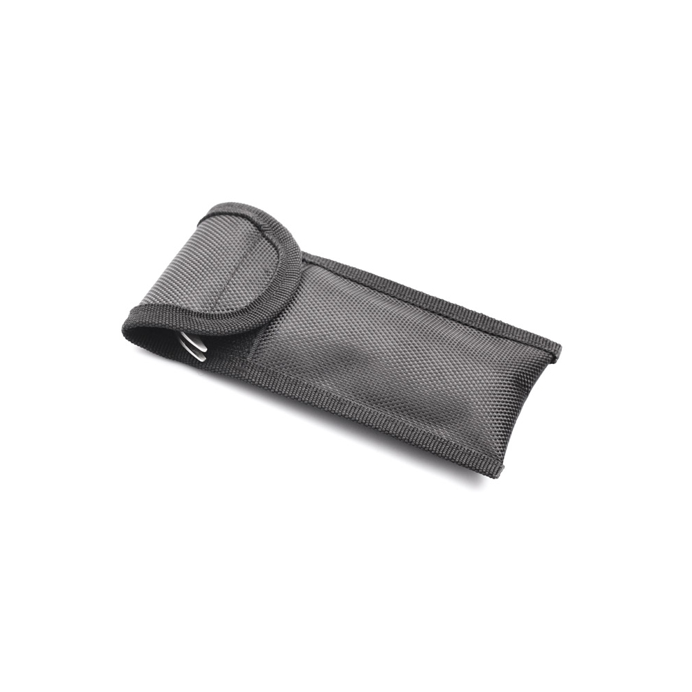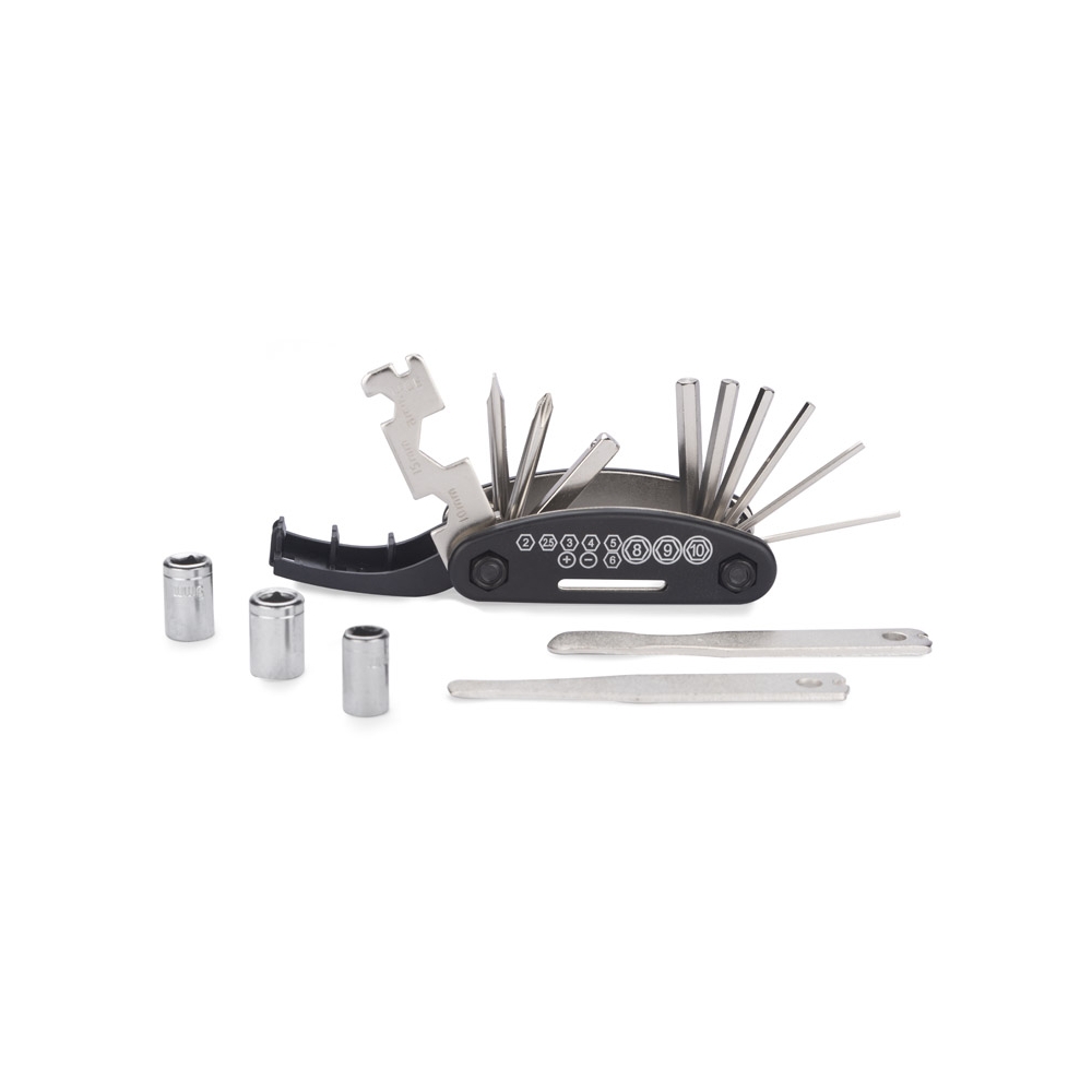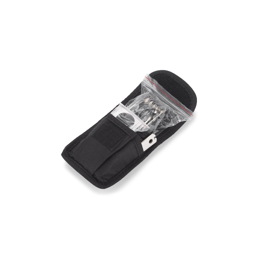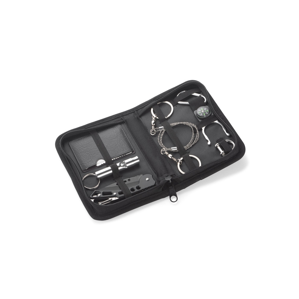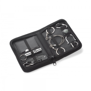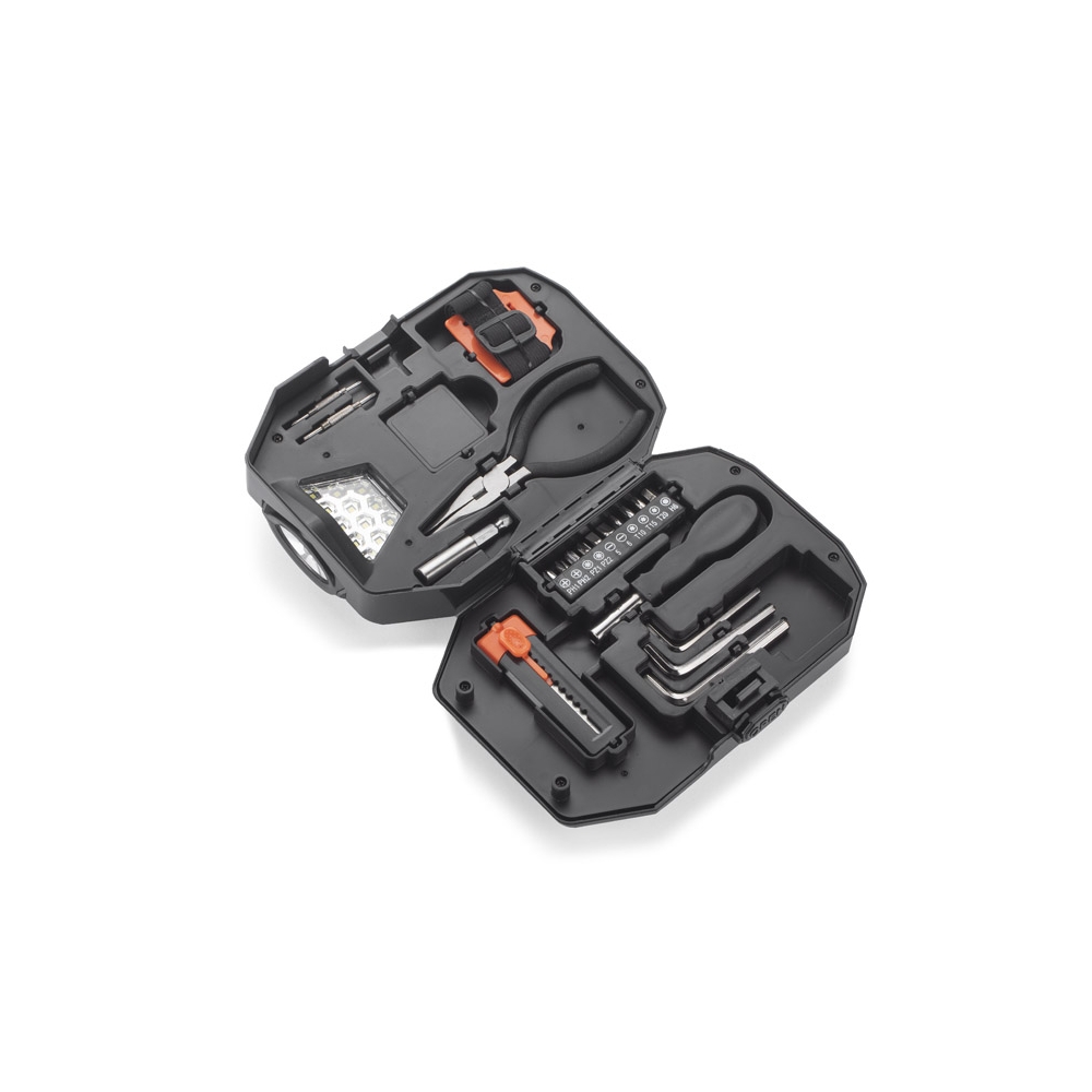 19-teiliges Werkzeugset in robustem Polyester-Etui mit Reißverschluss und Metallkarabiner. Enthält Befestigungswerkzeug, Schraubendreherköpfe (Schlitz, Kreuz und Torx), Schraubenschlüssel, verschiedene Inbusschlüssel und Öffner.