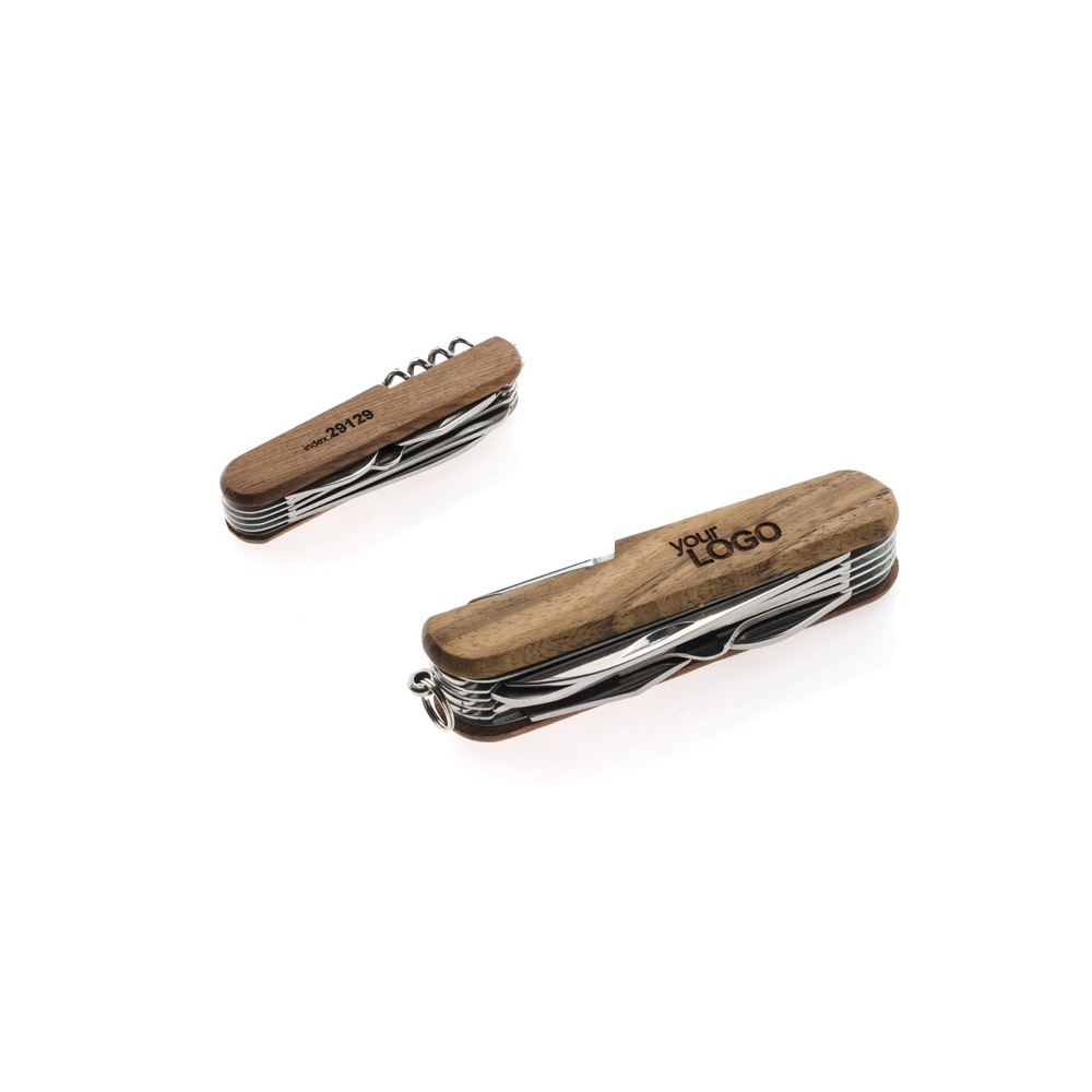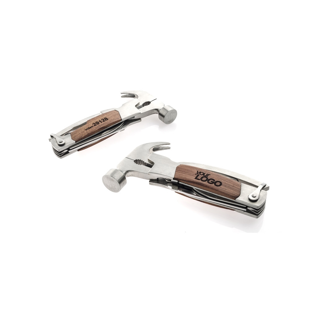 Hochwertiges Multifunktionswerkzeug aus Edelstahl mit Holzschalen. Zange, Messer, Säge, Schere, Schraubendreher etc. Wir lasern Ihr Logo auf eine Seite des Griffes.