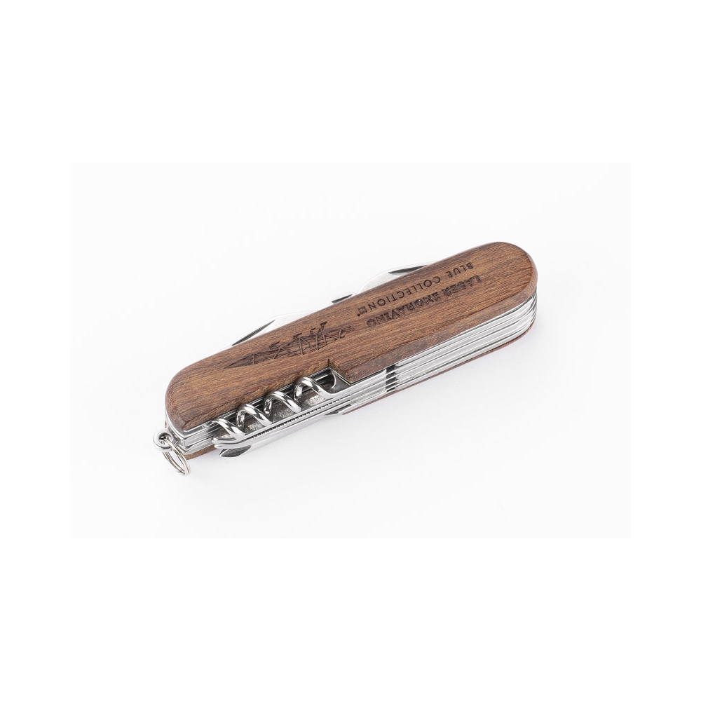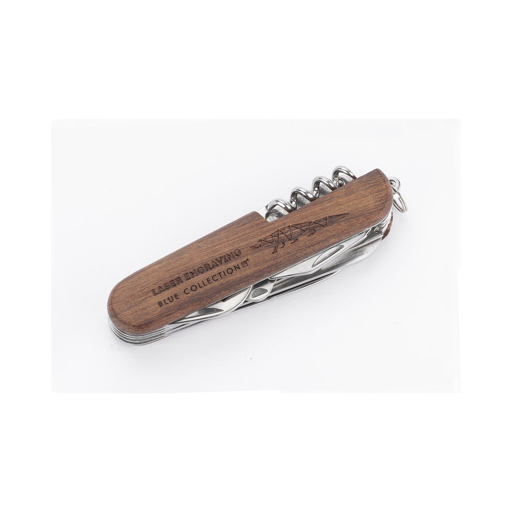 Taschenmesser mit einem holzbearbeiteten Griff, welches ihm einzigartigen Charakter und wunderschönes Aussehen verleiht. Dieses Taschenmesser verfügt über alle wichtigen Funktionen wie Messer, Säge, Fischschaber, Schere, Dosenöffner, Flaschenöffner, Schraubendreher, Korkenzieher, Ahle und .