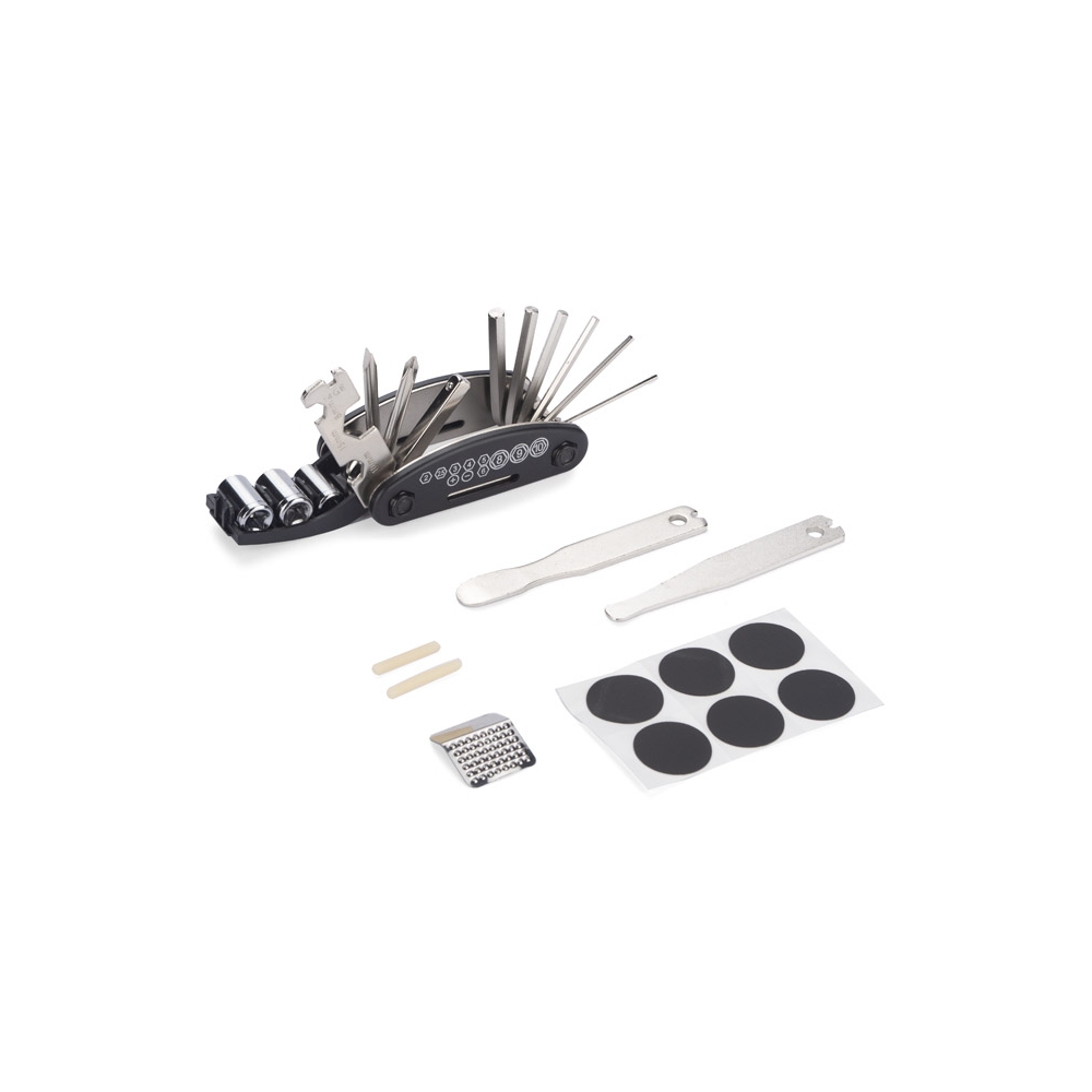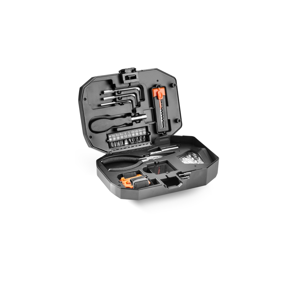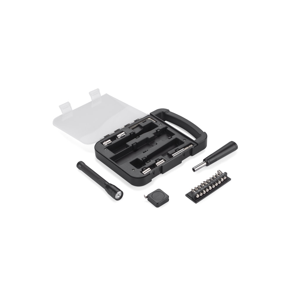 FIXO ist ein Werkzeugset in einem praktischen Koffer. Im Set befinden sich ein Inbusschlüssel, eine Taschenlampe, ein Maßband, ein Schraubendreher, zehn verschiedene Bits, eine Verlängerung und vier Steckschlüsseleinsätze von 7 mm, 8 mm, 9 mm und 10 mm.