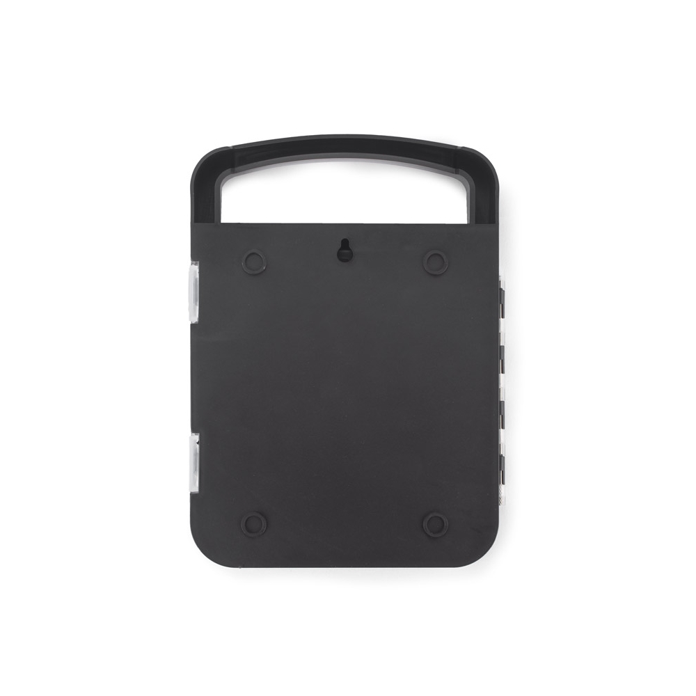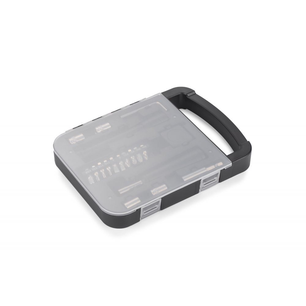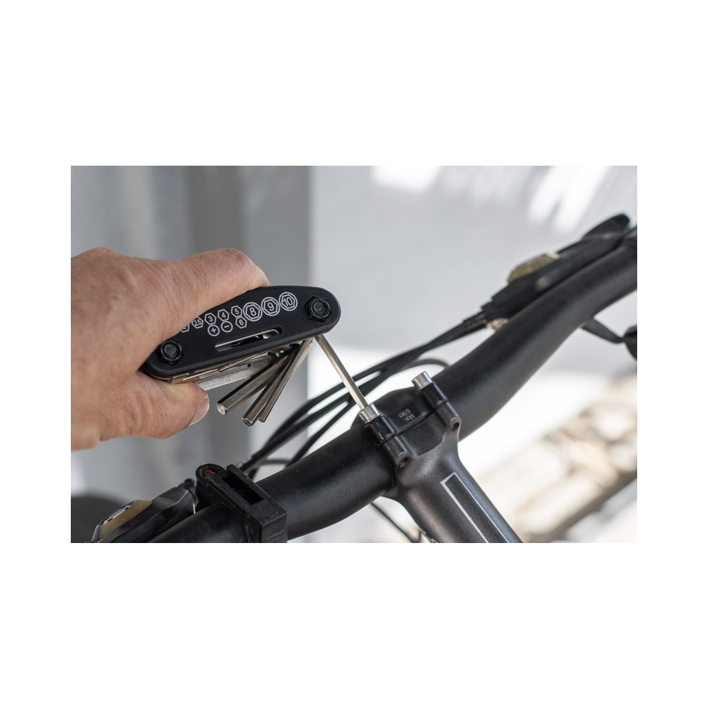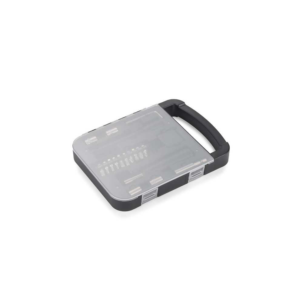 FIXO ist ein Werkzeugset in einem praktischen Koffer. Im Set befinden sich ein Inbusschlüssel, eine Taschenlampe, ein Maßband, ein Schraubendreher, zehn verschiedene Bits, eine Verlängerung und vier Steckschlüsseleinsätze von 7 mm, 8 mm, 9 mm und 10 mm.