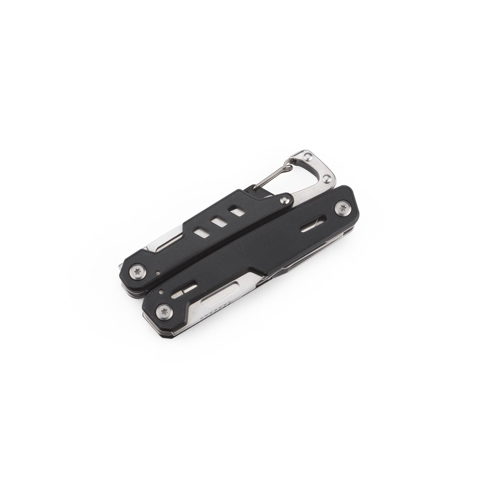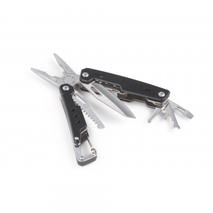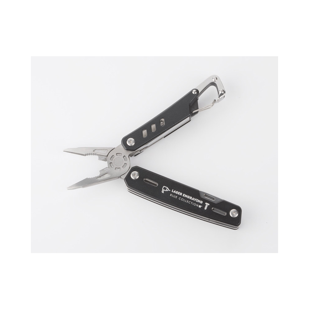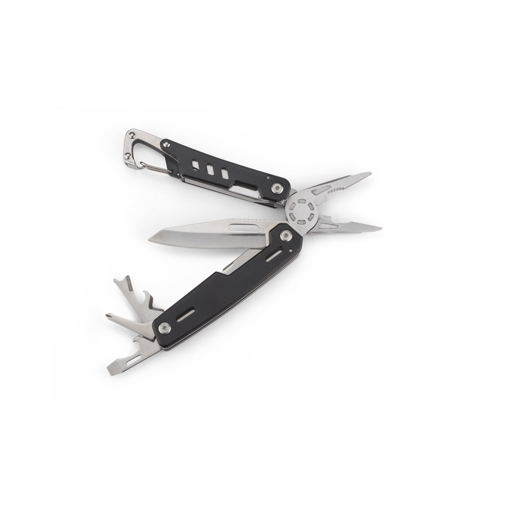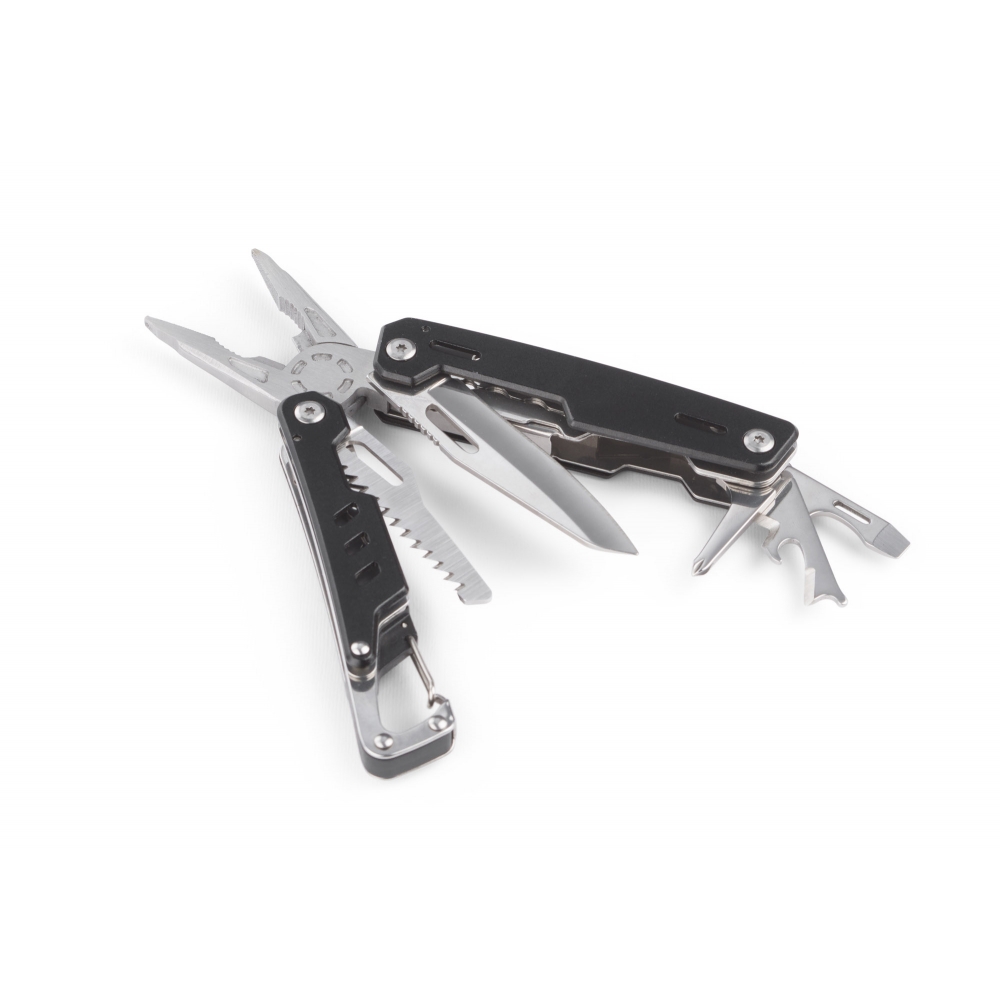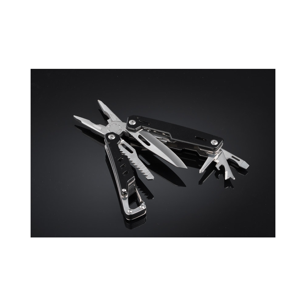 Multitool im Aluminium-Case mit 11 Funktionen aus Stainless Steel wie z. B. eine Zange, Messer, Schraubendreher, Säge, Dosenöffner, Karabiner und vielem mehr. In Geschenkbox verpackt.