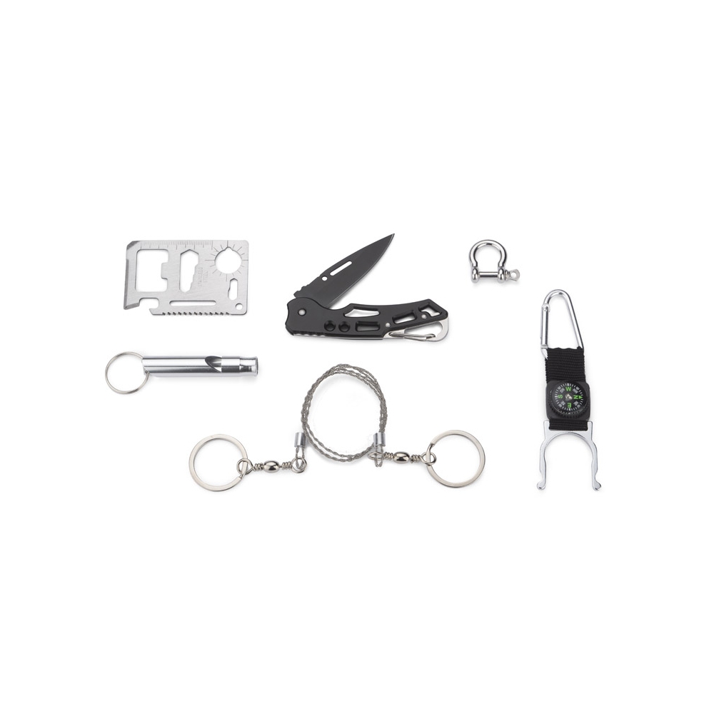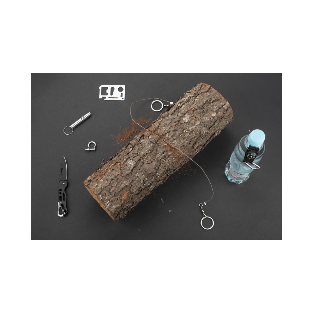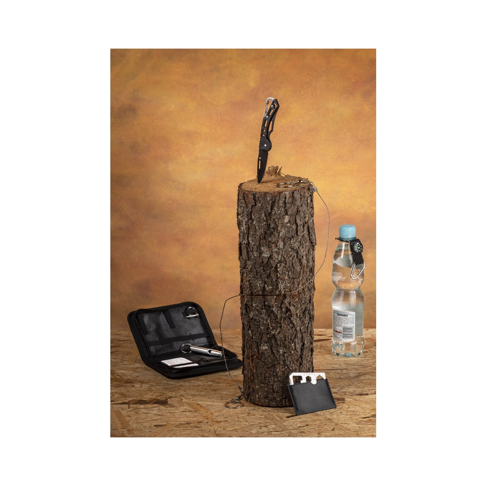 Das BALE Outdoor--Set ist ein Genuss für Survival-Liebhaber. In einem Set finden Sie alles, was auf vielen Reisen nützlich sein kann. Das Set besteht aus sechs Elementen: einem Flaschenhalter mit Karabiner und Kompass, einer manuellen Handkettensäge, einem Klappmesser, einer Pfeife, einem Segelschäkel und einer Überlebenskarte mit bis zu 11 Funktionen: Dosenöffner, Flaschenöffner, Schraubendreher, 4 cm Lineal, 4-Positionen-Schlüssel für verschiedene Schraubengrößen, zweireihige Säge, Zwei-PositionenSchraubenschlüssel und Lanyard- oder Schlüsselringloch. Das Set ist in einem schwarzen Etui verpackt.