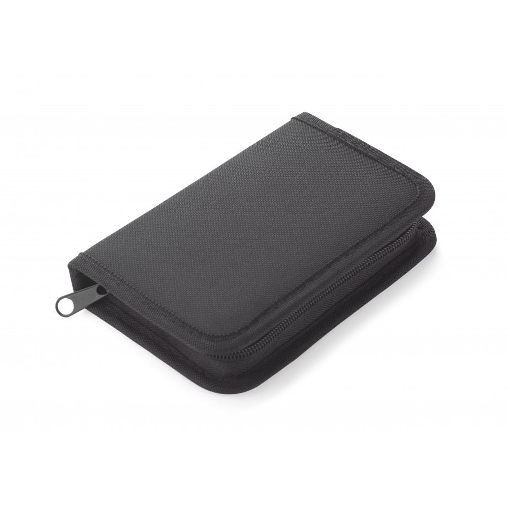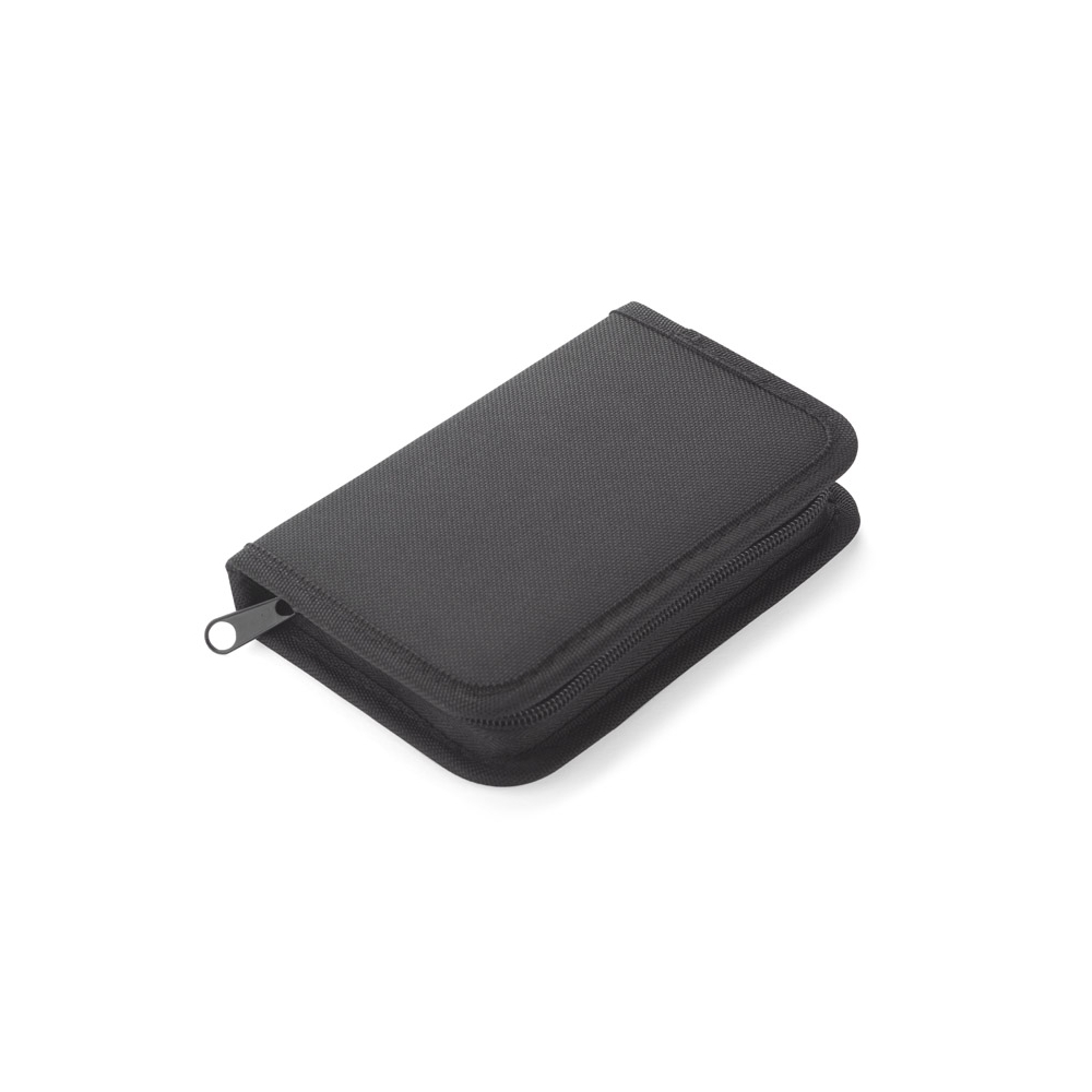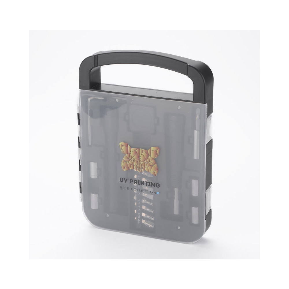 In diesem praktische Etui aus Kunstleder haben Sie stets das wichtigste Werkzeug zur Hand. Inhalt: 4 Stecknüsse, Schraubendrehergriff, 2 Feinschraubendreher, Cuttermesser, 9 Bits und Bitadapter, Maßband, Designhammer, und Zange mit Feder. Größe: 160 x 120 x 45 mm Werbeanbringung: Tampondruck Druckfläche: 65 x 35 mm