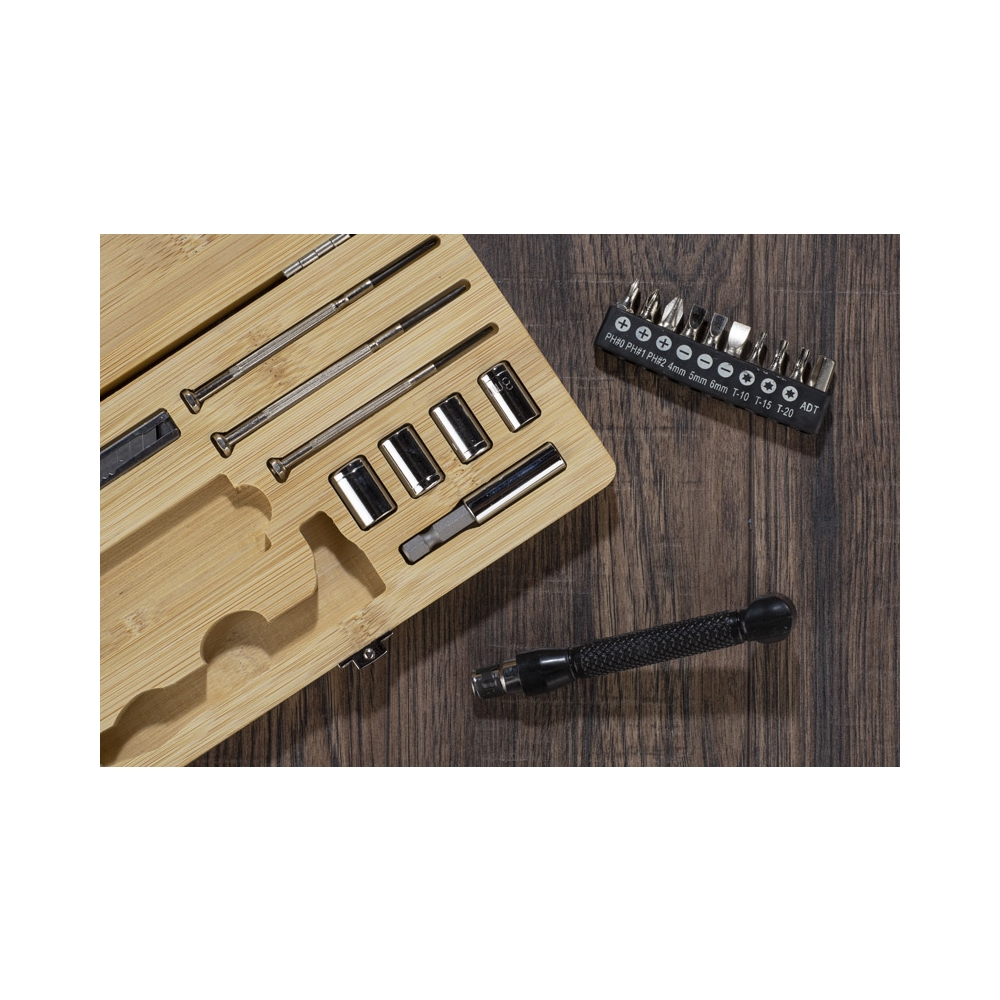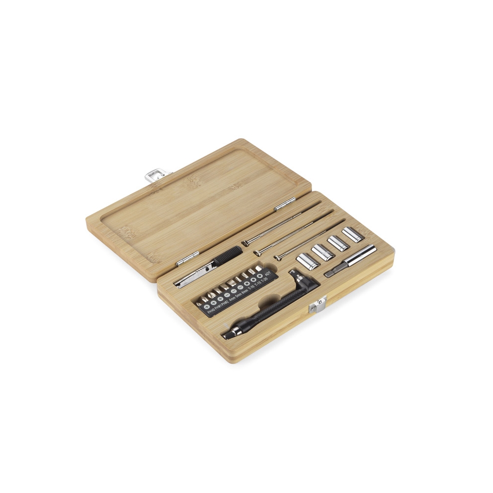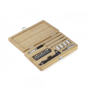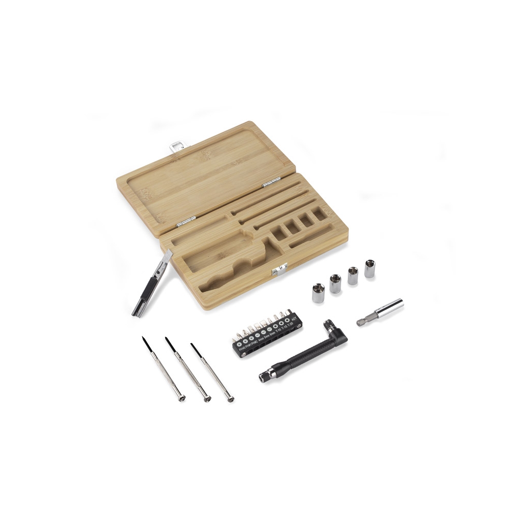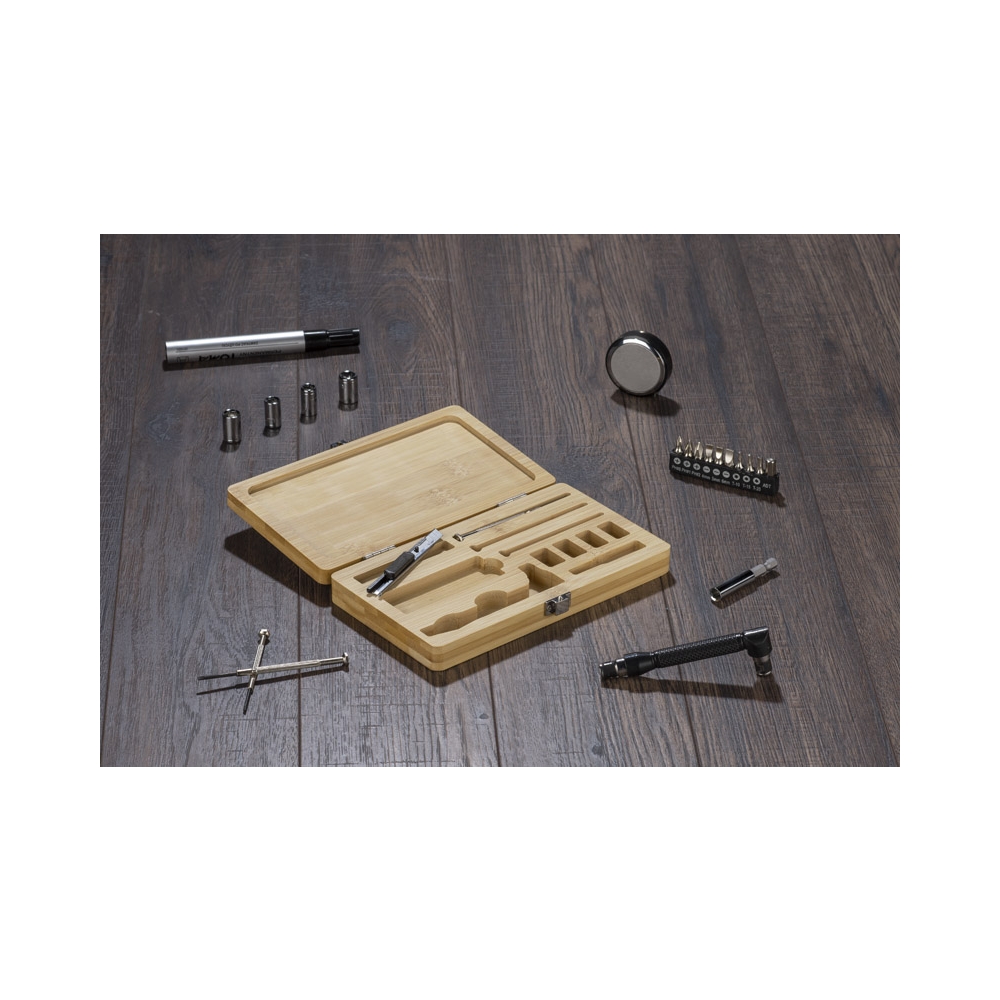 21-tlg. Werkzeugset aus Metall in einer Bambusschachtel. Beinhaltet: 1 Steckschlüssel, 1 Cuttermesser, 3 Präzisionsschraubendreher, 10 Bits im Halter, 4-tlg. Steckschlüssel-Nussset und 1 Verlängerung.