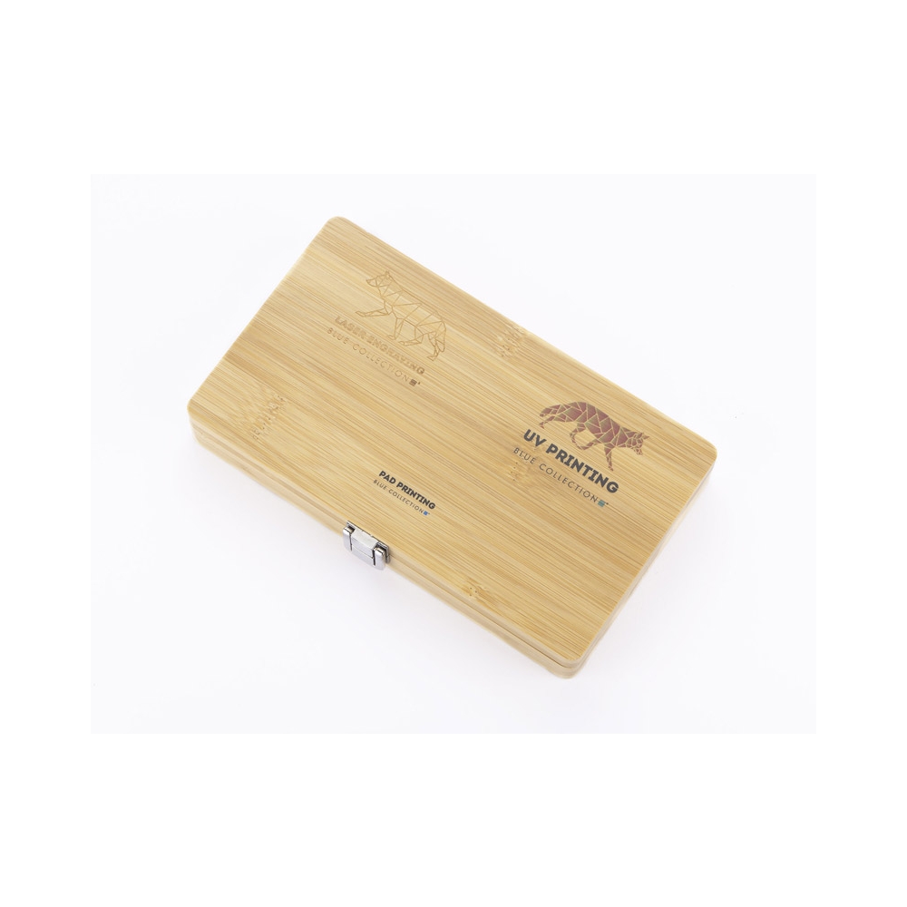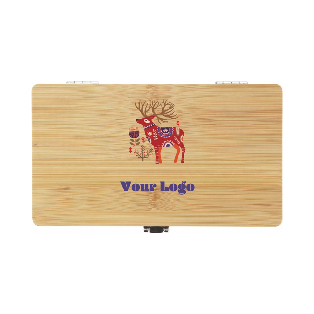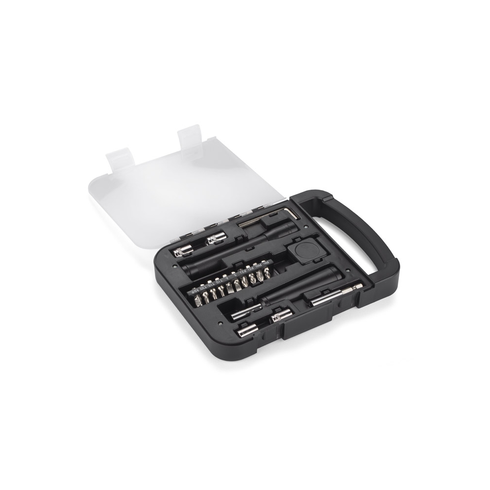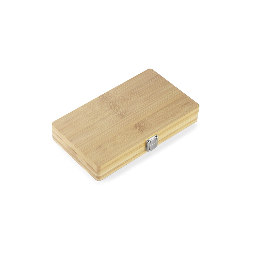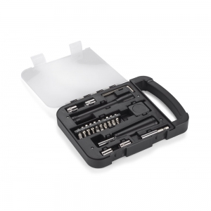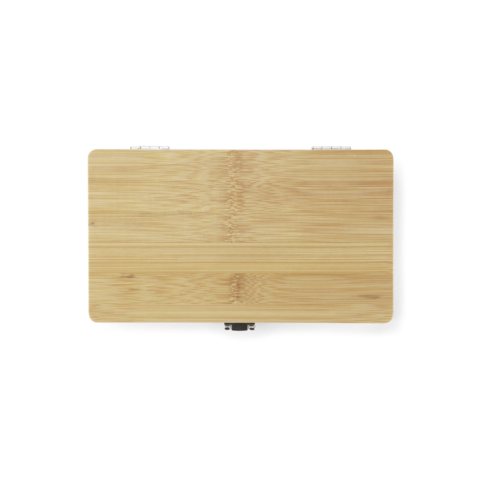 21-tlg. Werkzeugset aus Metall in einer Bambusschachtel. Beinhaltet: 1 Steckschlüssel, 1 Cuttermesser, 3 Präzisionsschraubendreher, 10 Bits im Halter, 4-tlg. Steckschlüssel-Nussset und 1 Verlängerung.