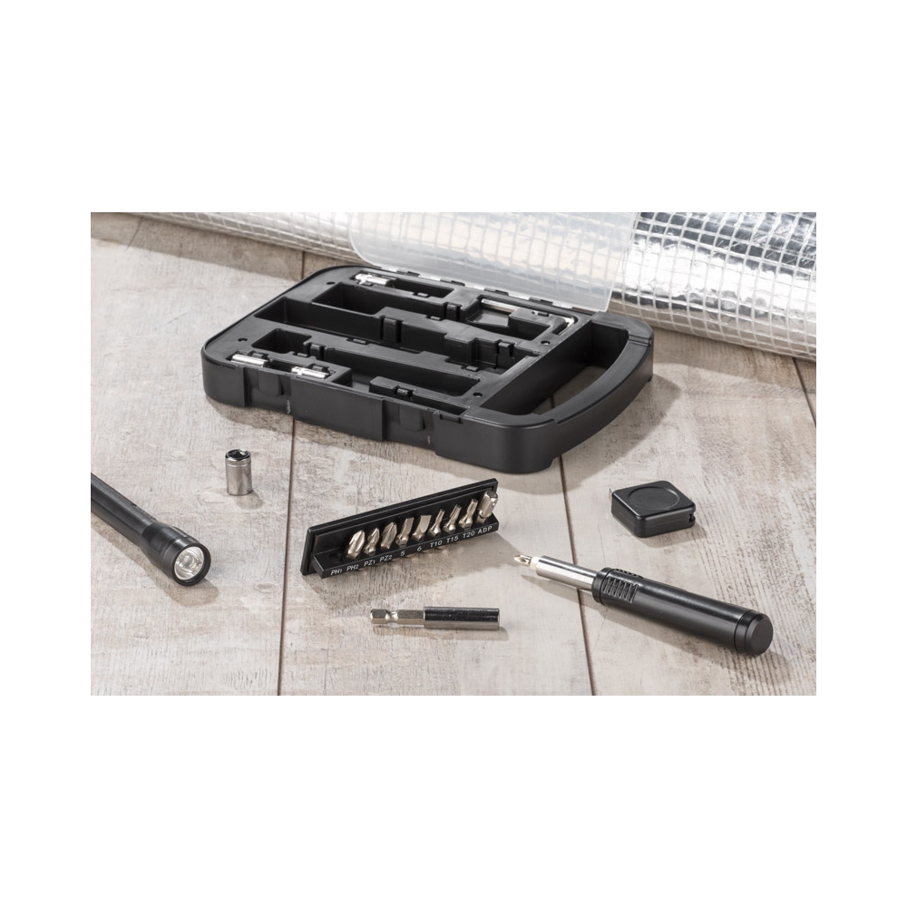 22-teiliges Werkzeugset in Kunststoffbox. Inhalt: 2 Schraubendreher, 1 Kombizange, 1 Griffstück, 2 Winkelschraubendreher, 5 Steckschlüsselaufsätze und 10 Bits.
