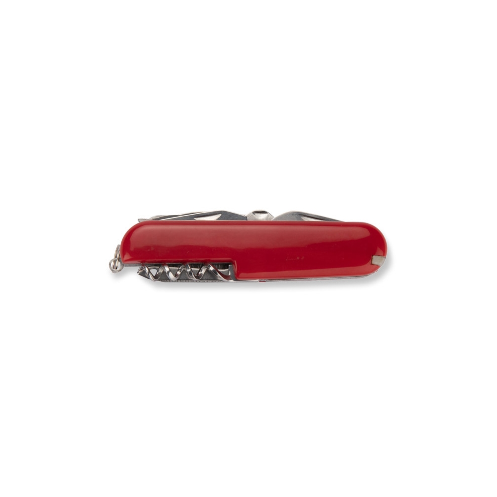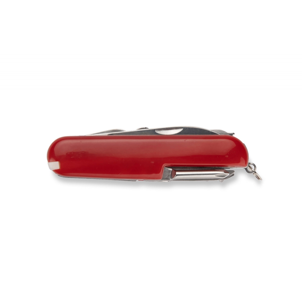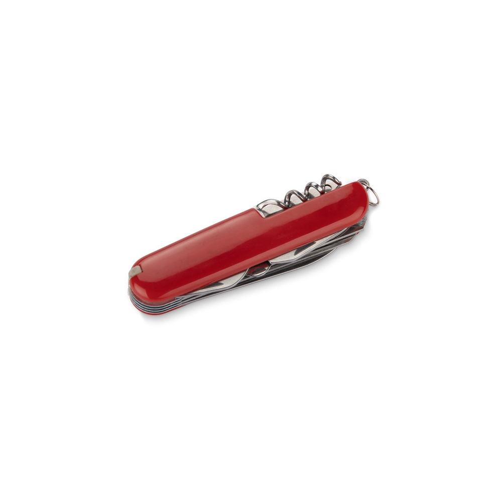 Multifunktionsmesser mit Edelstahl-Zubehör mit 10 Funktionen, beschichtet mit widerstandsfähigem ABS. Enthält Schneider, Schere, Pinzette, Kompass, Nagelfeile, Stechwerkzeug, Korkenzieher, Zahnstocher, Schraubendreher, Dosenöffner und Flaschenöffner.