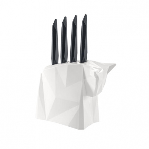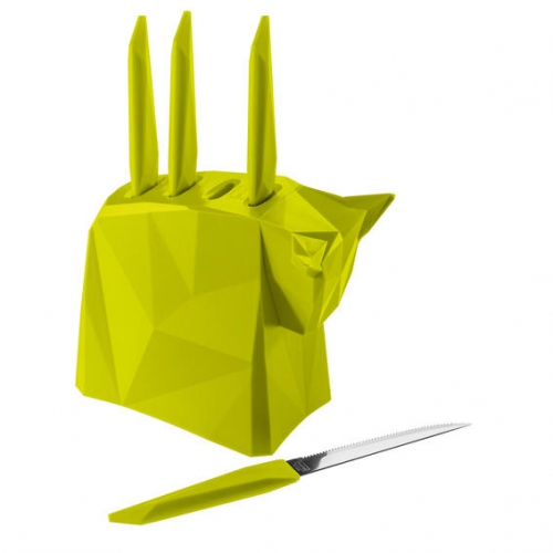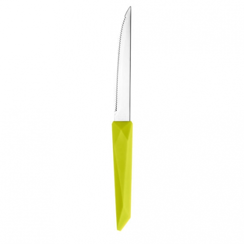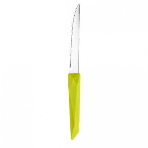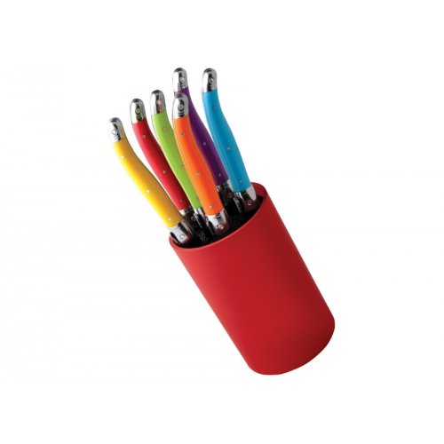 Artikel-Nr: 688DUB144Gezahnte Klingen aus 420s Edelstahl, lebensmittelkonform (Norm EN10088-2 2005). Griff aus farbigem ABS Kunststoff (6 verschiedene Farben): himmelblau, anisgrün, korallenrot, zitronengelb, purpur, orange. Nutzbare Klingenlänge: 11 cm. Lieferung in einem Ständer aus rotem Kunststoff, gummiert.
