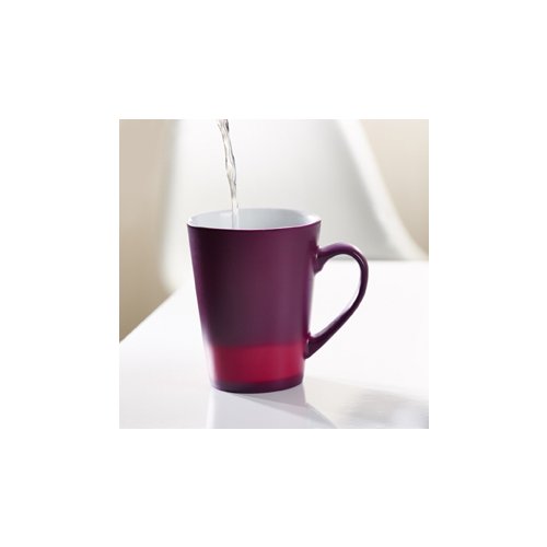Stylischer Latte Becher. Mit einer hitzeempfindlichen Oberflächenbeschichtung, die durchsichtig wird sobald heißes Wasser eingefüllt wird und somit den darunterliegenden Druck hervorbringt. Nur für Handwäsche.