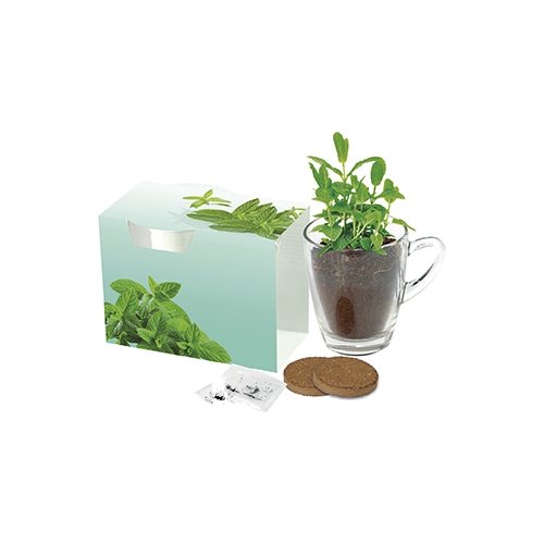 Eine formschöne Tasse aus Glas, in der Gesundheit und Wellness wachsen kann. Einfach die Erdtabletten mit Wasser aufquellen lassen, die Pfefferminz-Samen einstreuen und schon bald wächst die gesunde Pflanze. Die Pfefferminz-Blätter sind hervorragend für einen wohltuenden Teeaufguss geeignet. Die umlaufende Banderole bietet im Standardmotiv viel Platz für Ihre Werbebotschaft ab 250 Stück. Eine individuelle Gestaltung ist ebenfalls ab 250 Stück möglich.