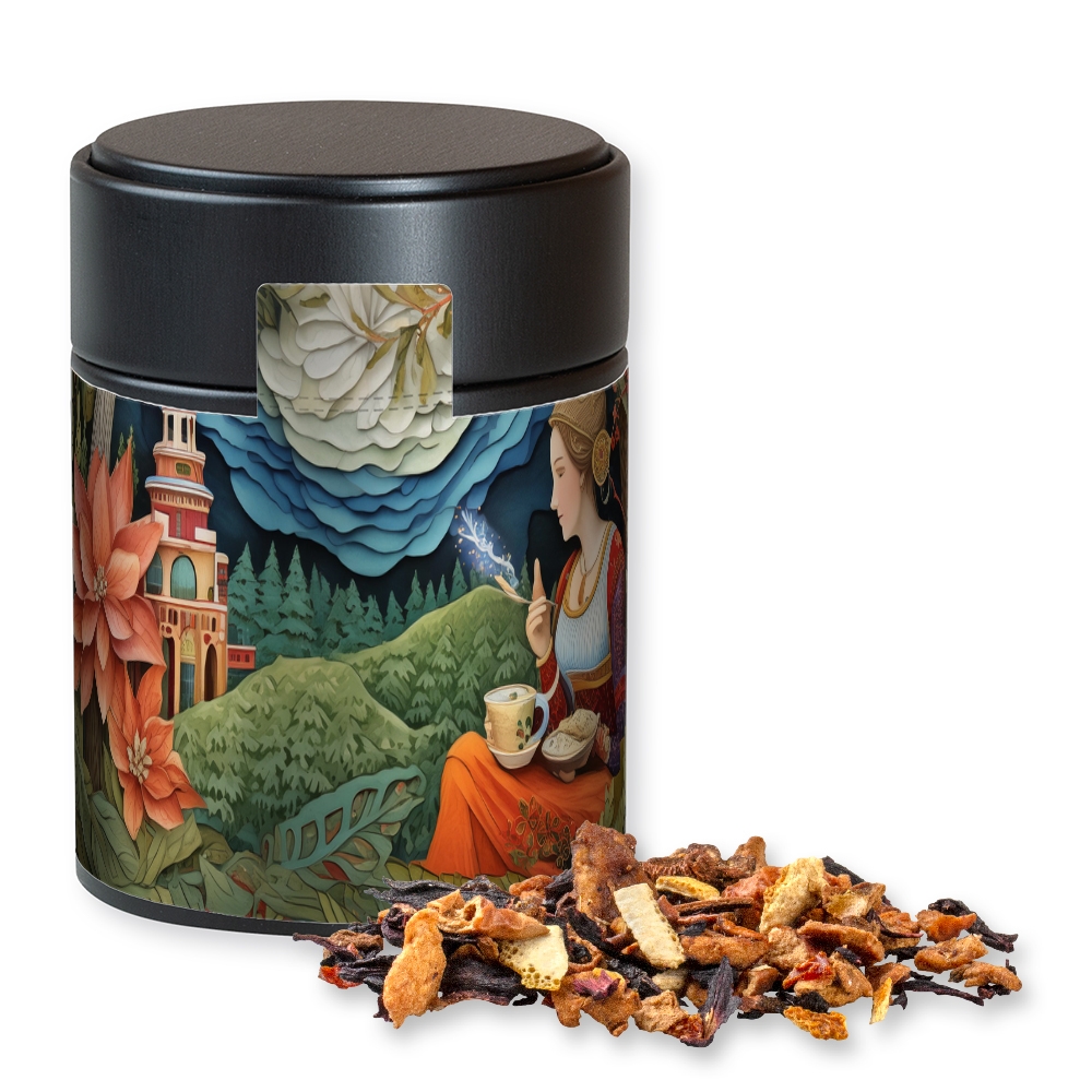 Zutaten: Hibiskusblüten, Hagebuttenschalen, Apfelstücke, Rooibos, Mandelstücke (7 %), Orangenfruchtspalt ...
