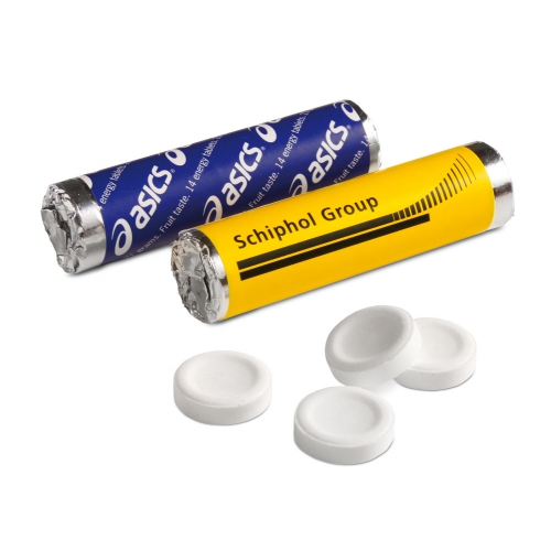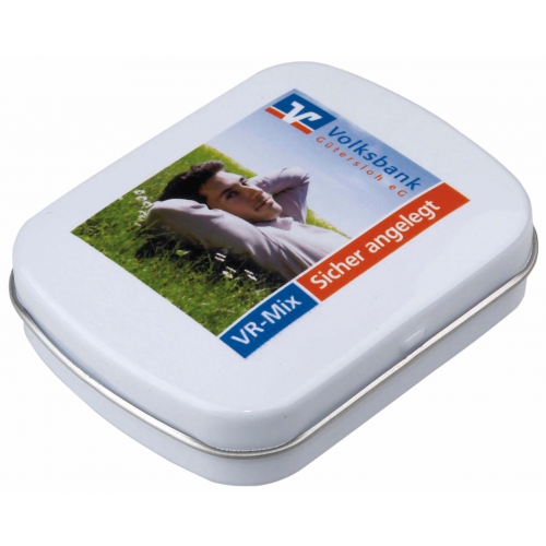 Artikel-Nr: 8791051Weiße Metalldose mit 'Plopp'-Verschluss, eingeschweißt in transparenter Folie Durchmesser 53 mm, Volumenabfüllung: max. 20 g, Füllung A: Mint-Pastillen, Schoko-Konfetti bunt, Mint-Sternchen, Traubenzucker-Pastillen, Traubenzucker Herzen Zitrone o. Orange, Traubenzucker Sanddornfrucht oder Salmiak-Splitter, Druckart: Tampondruck