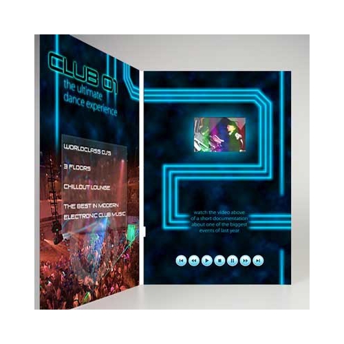 Innovative Video-Werbekarte für Produktpräsentationen und Marketing. Die Karte wird komplett individuell nach Kundenwünschen hergestellt. Öffnet der Empfänger die Promotion-Karte, wird das Video abgespielt. 2.4", 3,5", 4,3" oder 7,0" Zoll TFT-LCD Monitorgrößen sind möglich. Video format support: RM/RMVB/AVI/WMV/FLV Audio: MIDI/WMA/WAV/5EQ Default Setup: Video, Photo or Image+background music Charge by USB-Port Power supply: batteries or recharger battery Accessoires: USB-Kabel möglich