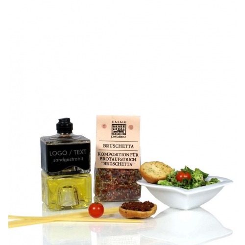 Artikel-Nr: A276K00972Präsentset bestehend aus einer köstlichen Gewürzmischung Aglio Olio, in Kombination mit einer schönen Schmuckflasche Opera, befüllt mit hochwertigem Olivenöl extra nativ. Abgerundet wird dieses Set durch zwei leckere Tartufo nero al torrone, welche für den süssen Feinschmeckergaumen in nachhaltiger Erinnerung bleiben. Werbemöglichkeit durch Veredelung der Schmuckflasche mit Ihrem Logo durch Sandstrahlung. Inhalt: Schmuckflasche Opera 0,1 l. - sandgestrahlt / Füllung Olivenöl nativ extra / 100 g. Aglio Olio Würzmischung / 2 x Tortufo nero al torrone a 18 g / Präsentkartonage mit Sizzle Pak.