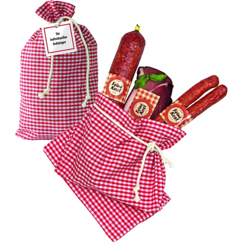 1 Paar Feine-Kost Kaminruten, über Tannenreisig geräuchert, 130 g. 1 köstlicher Feine-Kost Schinken, ca. 200 g. 1 Feine-Kost Knoblauch-Salami, ca. 200 g. Verpackt in schönem Stoffsäckchen. Geschenk- / Präsentset für Ihre Kunden zu Weihnachten.