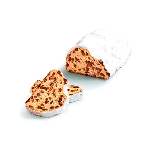 Handgeformt, 750 g, mit 10 % Marzipanfüllung, mit viel Rosinen, Mandeln, Orangen- und Zitronenschalen. In Silberfolie mit Banderole und im Umkarton verpackt.