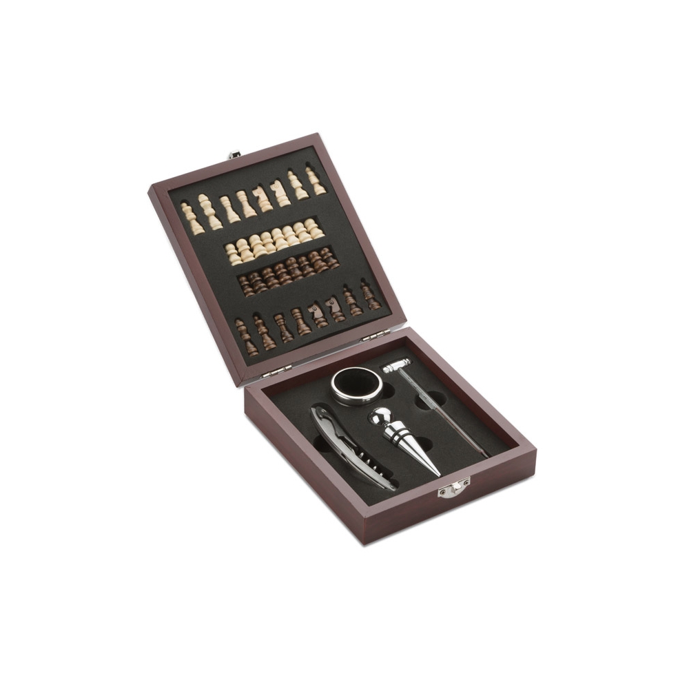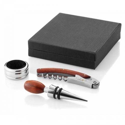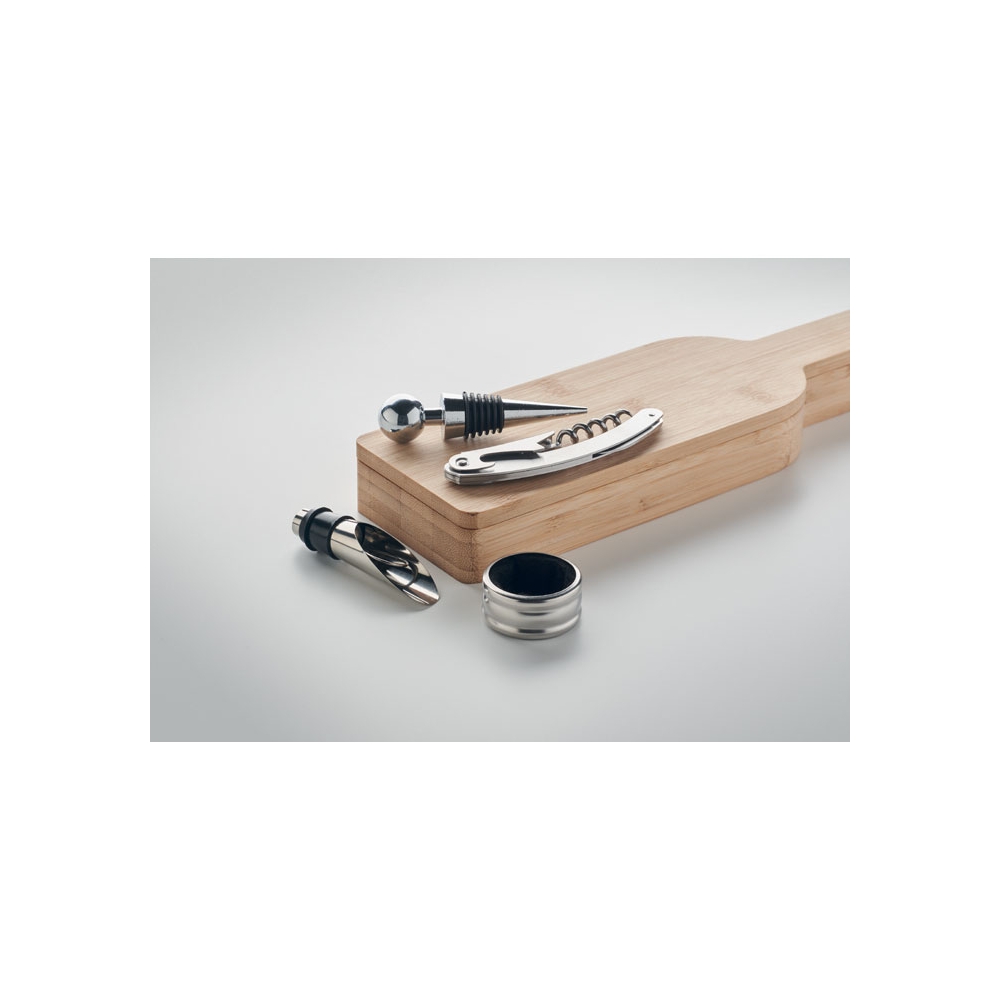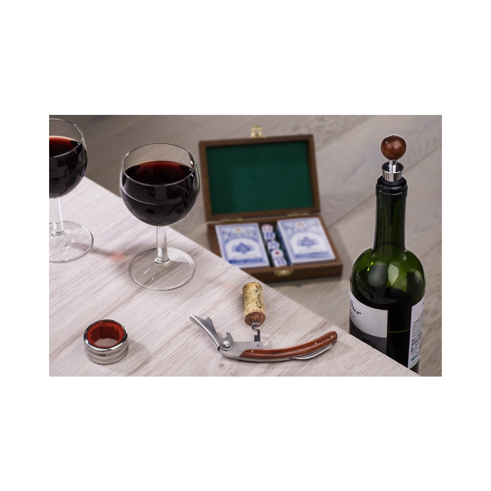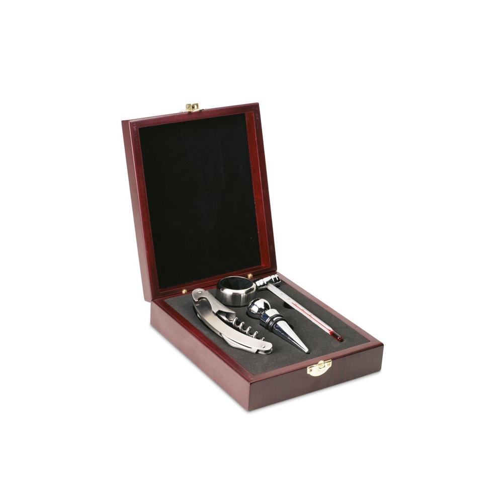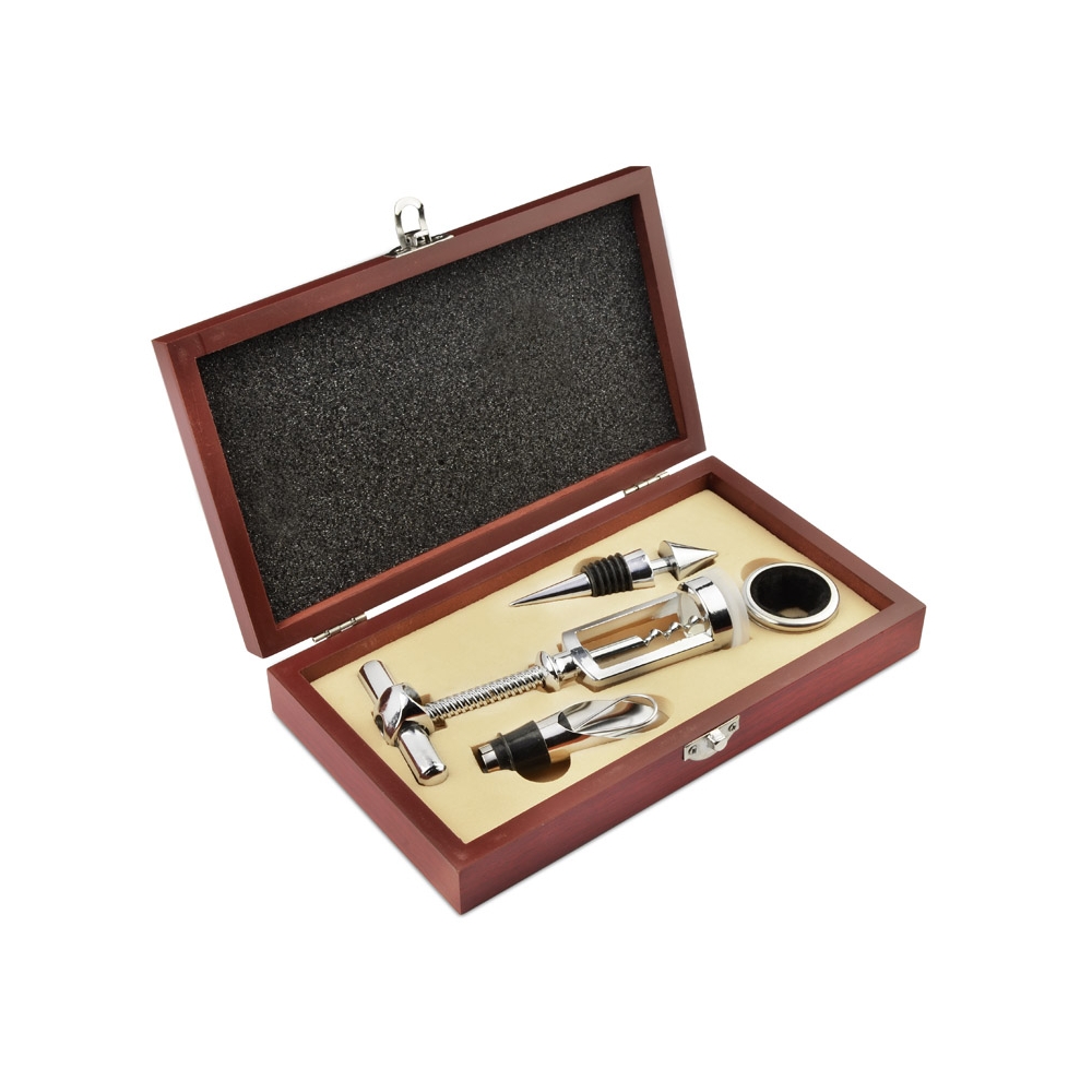 Artikel-Nr: OCBMO9523-40''Weinfass'' aus Holz mit 4 Accessoires: Kellnermesser, Flaschenverschluss, Weingießer und Folienschneider.