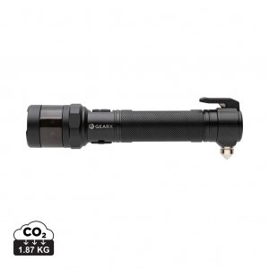 Artikel-Nr: XND513321Heavy-Duty Sicherheits-COB-Tool aus RCS-zertifiziert recyceltem Aluminium und ABS. Gesamter recycelter Inhalt: 59% bezogen auf das Gesamtgewicht des Artikels. Die RCS-Zertifizierung gewährleistet eine vollständig zertifizierte Lieferkette für die recycelten Materialien. Die Taschenlampe verwendet eine wiederaufladbare 2.000 mAh A-Grade Lithiumbatterie, so dass die Batterien nicht ausgetauscht werden müssen. Einfach über die USB-Buchse aufladen. Die Taschenlampe liefert leistungsstarke 500 Lumen und hat einen Leuchtstrahl von bis zu 100 Meter. Die LED-Leuchte verfügt über 4 Modi (100%, 50%, 30% und Blinken). Mit roter Notfall-LED, die in 3 Modi betrieben werden kann (schnelles Blinken, langsames Blinken und SOS). Mit integriertem Gurtschneider und Scheibenhammer, sowie mit Magnet zur Befestigung an einer magnetischen Oberfläche. Betriebsdauer mit einer Ladung: bis zu 2 Stunden. Wasserdicht nach IPX 4.