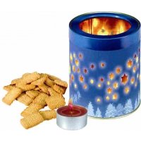 Inhalt: Metalldose (nutzbar als Windlicht) mit ca. 100 g Butterspekulatius und Duft-Teelicht