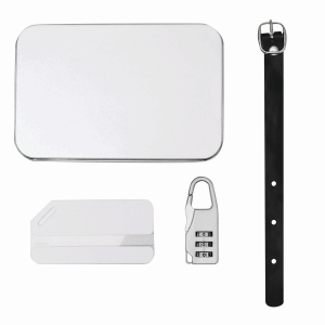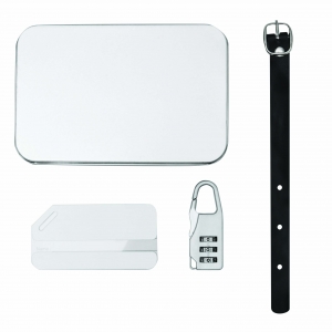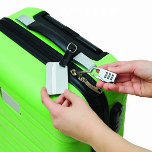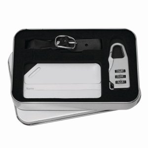 Artikel-Nr: INP56-0407070Gepäckanhänger-Set FAR AWAY, 3-teilig: bestehend aus Aluminium-Kofferanhänger mit herausnehmbarer Adresskarte, Zahlenkombinationsschloss mit Karabinerhaken (der Karabiner ist NICHT als Sicherung beim Klettern geeignet) und Anhängeband mit Schnalle, in Metallbox