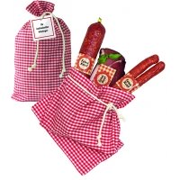 Artikel-Nr: F146407591 Paar Feine-Kost Kaminruten, über Tannenreisig geräuchert, 130 g. 1 köstlicher Feine-Kost Schinken, ca. 200 g. 1 Feine-Kost Knoblauch-Salami, ca. 200 g. Verpackt in schönem Stoffsäckchen.
